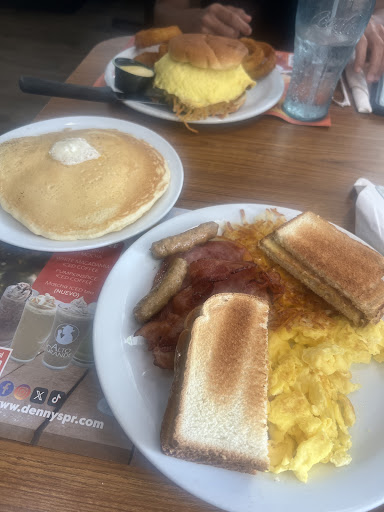 My husband and I really like Denny's. But our experience here wasn't that great. First, we get in and the employee asks us if we wanted a table for two. We say yes, and then she starts just pointing tables with attitute and without telling us nothing. So we assume we can sit anywhere. Our waiter arrives and we asked for the 9 grain pancakes. When we get them I notice there's some kind of leftover grease on top of my pancakes that smelled like they cooked some burgers and then tossed the pancakes on the same pan without cleanning it. My husband tried them... and just as I expected..they were awfull. So we asked the waiter if she could replace them. Eventually, they gave us another set of pancakes . They were regular wheat pancakes (not the 9 grain we asked for) one was almost burnt, and the other one was ok. We decided to just eat them like that so we could just go. I give it 2 stars because the french fries and waffle fries were good and the waiter did her best, given the time and circumstances.