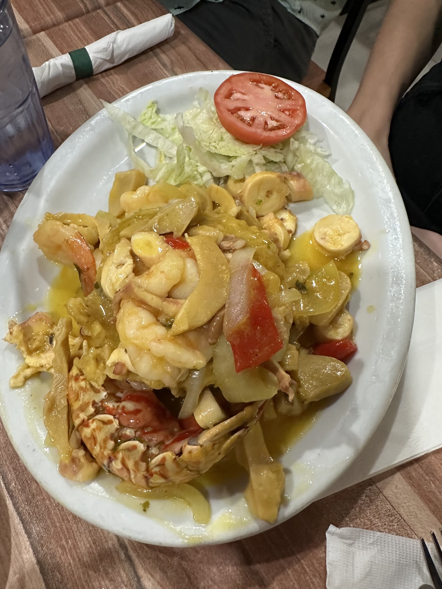 we had quite a bit of food shrimp mofongo in butter sauce (to die for) Chicken finger w fries ( kids loved it) platter for two ( picadera. WOW DELICIOUS) Consume soup ( My father enjoyed it.)
