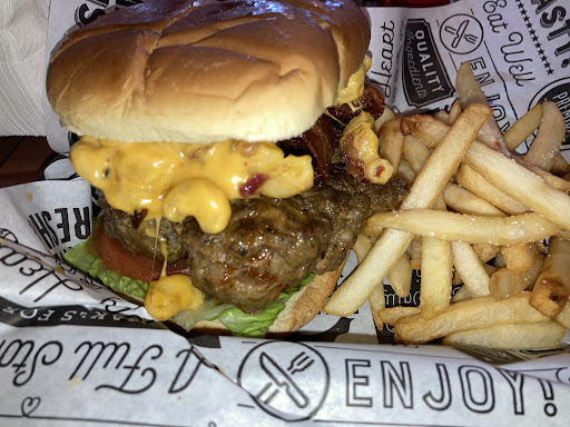 So visiting PR, my girlfriend and I visited this spot that was down the street from where we were staying. After looking at the menu, I ordered the Mac & Cheese burger, added bacon, lettuce, tomato and grilled onions.