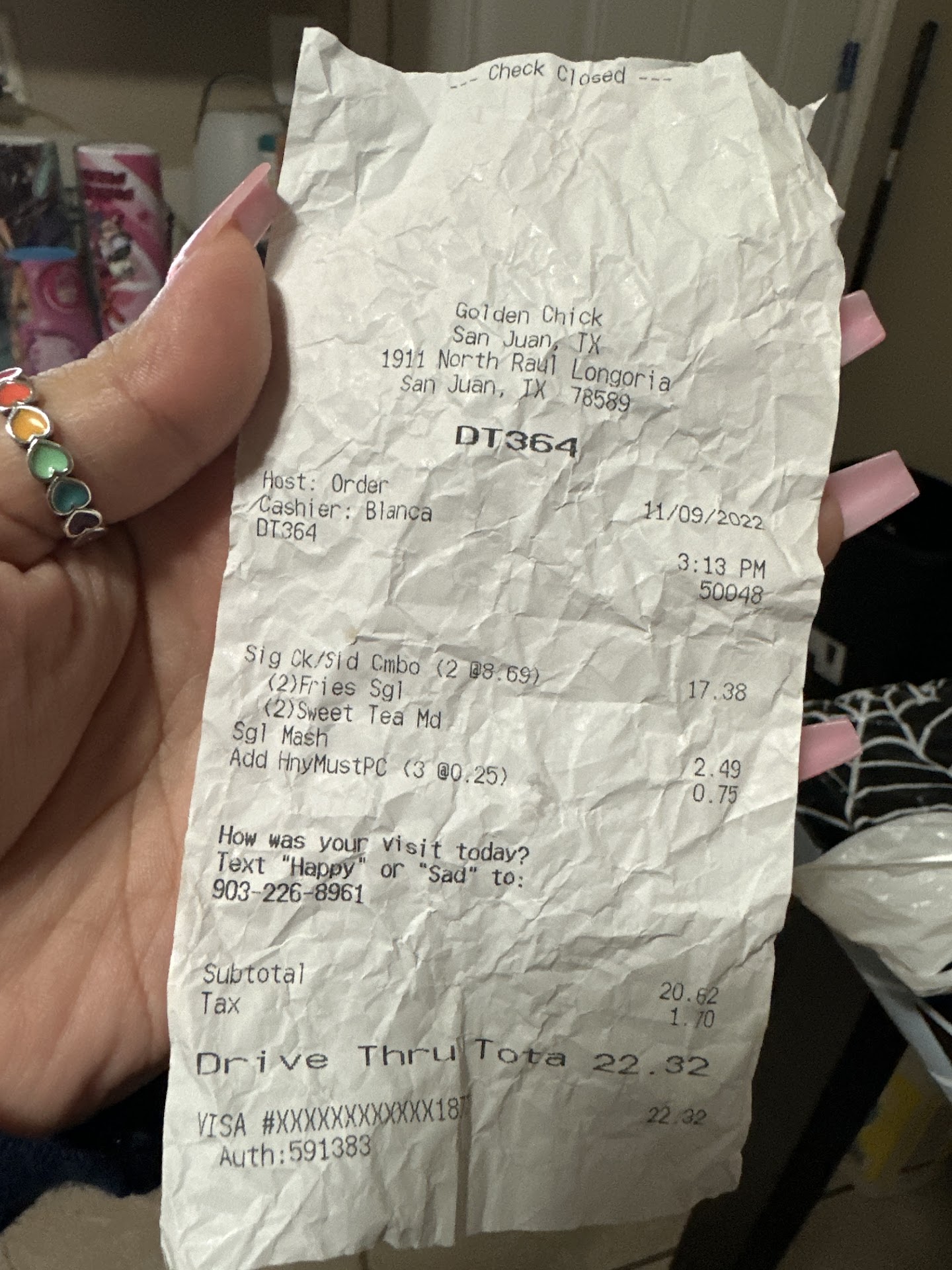 My bad Experience with Golden Chick started when I got home and I realized that my wings were the wrong ones. I called the store and there was no answer. I decided to wait till the next day to drive over there because it was already too late and it was a 20 minute drive to get there. So I went back on the 7th around noon And that's when my bad experience started. When I explained to the lady that was the cashier in the drive through windowthat my order was wrong and that i would like it done right she said it was too late because the order was from the night before and i should have called then so it was too late for me to do anything even if i did bring back the complete order with the recreipt. so i asked for the manager and she was worse than the cashier. as she came to the window i could see she angry and had a very bad atitude demanding my credit card that I used to pay with because she was gonna give me a refund. when i never asked for a refund. I told her I wasn't asking for a refund i just wante my order done right. Her response was, well, you should have called last night. So I said, I did call. Would you like to see my phone history? Her response was I should have kept trying. Because she was busy on the phone with someone at the time that I called. At that point I just said she's just throwing up roadblocks and escalating the situation, so I just decided to give her my credit card and get the refund. and she had an atitude all the way to the end. I do want to give two thumbs up to the cashier from the night before, Mykel. For being calm, courteous, apologetic and sympathetic For fixing the first mistake, I discovered on the same order. Great food, just bad management. The other rude employees are probably learning it from management. Recommendations. More training into customer service and customer satisfaction. Let me know people who is wrong in this case the customer or...