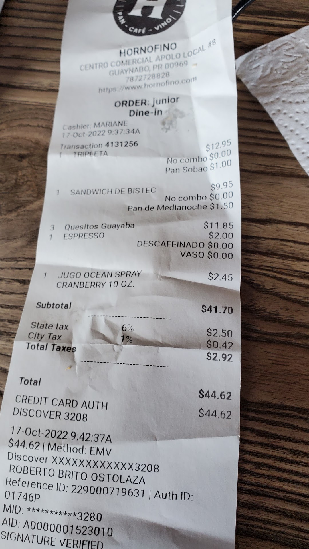Read moreWe typically don't leave reviews, but this one is long overdue. After a lifetime of supporting Hornofino, we regret to say that we will no longer be returning. The service and quality have consistently declined over time. The service has become incredibly slow, and our orders are frequently incorrect. Despite several mishaps, we continued to visit because of our fondness for the bakery's “mega quesitos”. However, our most recent experience was the final straw. We ordered two combos, and not only was our order incomplete, but the attendant was also rude and dismissive when we pointed out the issue. After a frustrating back-and-forth, they finally issued a refund for the portion of the order we didn't receive. Unfortunately, this experience has made it clear that Hornofino is no longer the bakery we once loved. We will not be sponsoring or returning to this...
