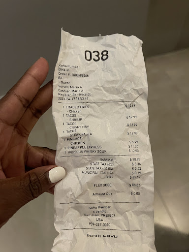 Read moreIt was our last night so we did our research to find somewhere good to eat. It was around 10pm so it wasn’t busy and we were seated quickly. The drinks we ordered were good however the food awful. We ordered the “kebabs” aka pinchos, fried chicken and fried fish tacos. We ordered the grilled pinchos and got the marinated version instead. It was chicken which was very dry and smothered in Kraft bbq sauce, no veggies. The tacos were not seasoned and they tried to compensate flavor for a half a pound of processed cheese. After the food arrived we never saw our waitress again. We waited so long that one of us had to go upstairs to the bar to get someone’s attention. We asked for another drink, the check and a to go box to feed the food to the stray animals. A different waitress came to our table 10 minutes later with a drink and check, no to go box. 20% gratuity was included which we don’t mind paying if the service is good. We understand the food quality isn’t their fault but we shouldn’t have to chase our waitress to get service. Don’t waste your money or vacation experience here, there are better...