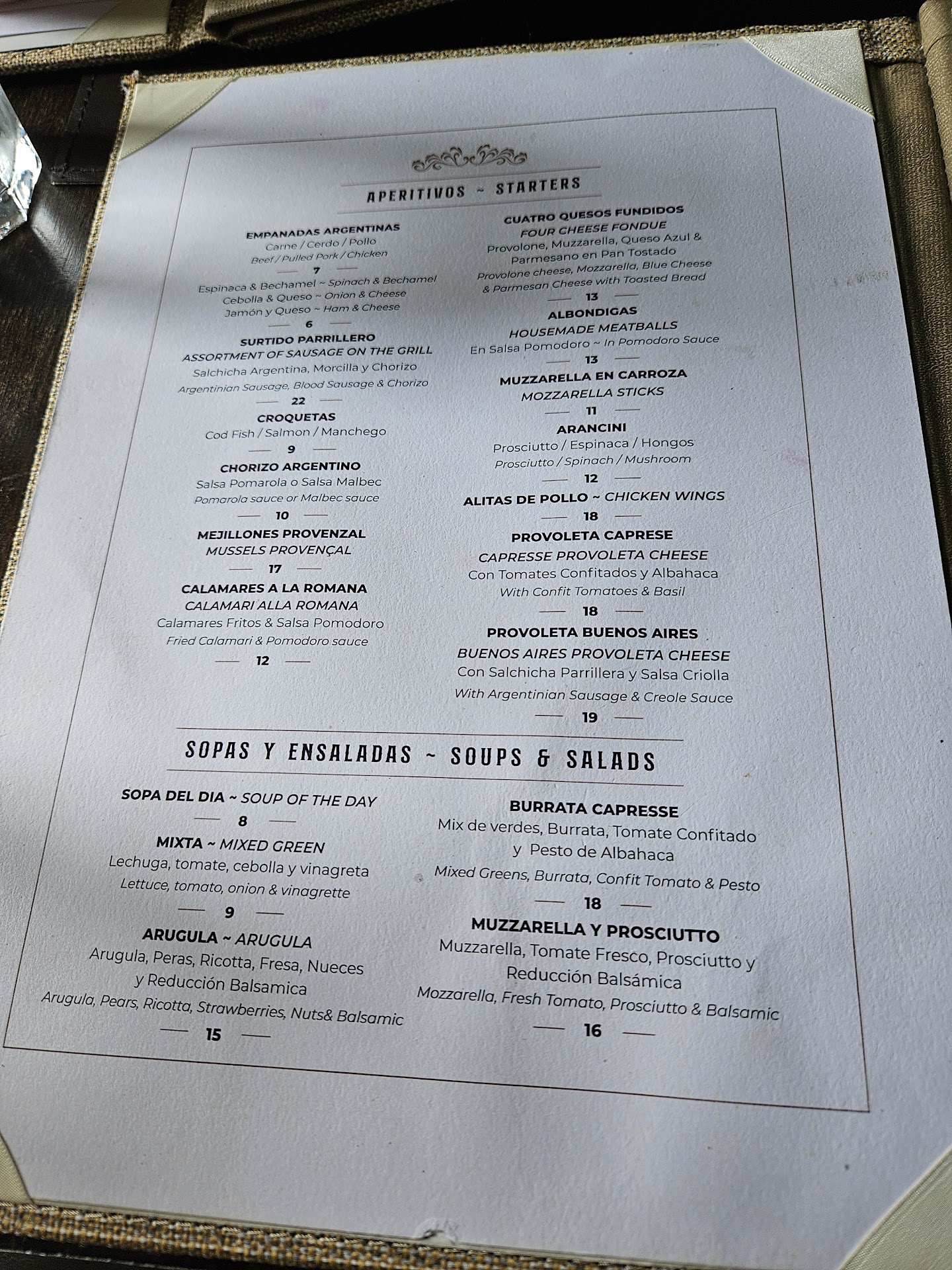 So we went to the Cantina Argentina last Sunday to see what all the fuss was about, and we were pleasantly surprised not as much with the food but with the staff and ambiance. The place has excellent decor, the setting is super cozy, and the staff is magnificent. As for the food, we started with their four cheese fondu and the Argentinian sausage and a pair of Lamina Cocktails. The four cheese fondu was magnificent, the balance of the four cheese, one of the best I have ever had, and the toasted bread was just the right serving tool to lap it all up. The argentinian sausage was also very good, but their house chimichury is at another level and is a must try for any visitor. The Mina cocktails were so smooth that we ordered one to many 🤣! I highly recommend them! As for main dishes, we ordered the 12oz churrasco with a side of four cheese fettuccine and personal Lugano pizza. The churrasco was fresh and well cooked but over salted, while the fettuccine had spectacular textuer, but the sauce lacked creaminess and had way too much gorgonzola which overshadowed all other flavors. The lugano pizza, on the other hand, was totally underwhelming and lacked flavor. For takeout, we ordered a milanesa florentina with the sauce on the side and an order of sweet potatoes ñoquis with vodka sauce. The milanesa was huge it could easily serve 2 people and was well made. Their ñoquis had awesome flavor, but the sauce was flat and grainy. As for dessert, we ordered the Chocotorta, and it was the bomb (second best plate of the meal after the fondu),the flavor profile was intense and was the perfect way to end the meal. Overall, i would recommend this restaurant for people looking for a nice place to chat or hang out in small groups over drinks...