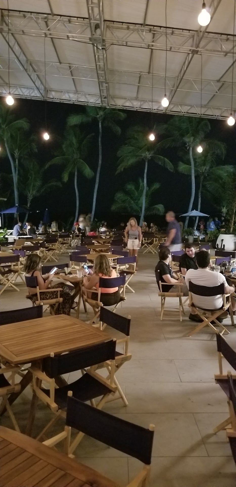 Chill, open air space with teak tables, director chair and picnic table seating. Beach style couches and arm chairs sprinkled throughout. All surrounded by an industrial vibe, and shipping container food stands. Music plays in tbe background and the echo of conversation bounces off the metals walls, but not unbearably so. There is a grassy area with picnic tables right next to the ocean...yup, magical.
