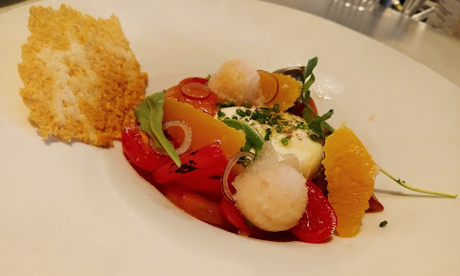 We did not have a reservation but they were able to accommodate us at the bar which was spacious and lush! We ordered a beautiful Cabernet and the Burrata appetizer….then it arrived. Most of us have had burrata, but I can assure you never like this!!! Of course the burrata was fresh, heirloom tomatoes perfectly ripe…parmesan crisp, rich and crunchy but then there was the TOMATO SORBET..OMG…WOW…this was true FLAVOR-PACKED PERFECTION!! It was like one of those things you would never think a dish needed and then you try it and realize all other preparations were lacking. An absolute STUNNER!!