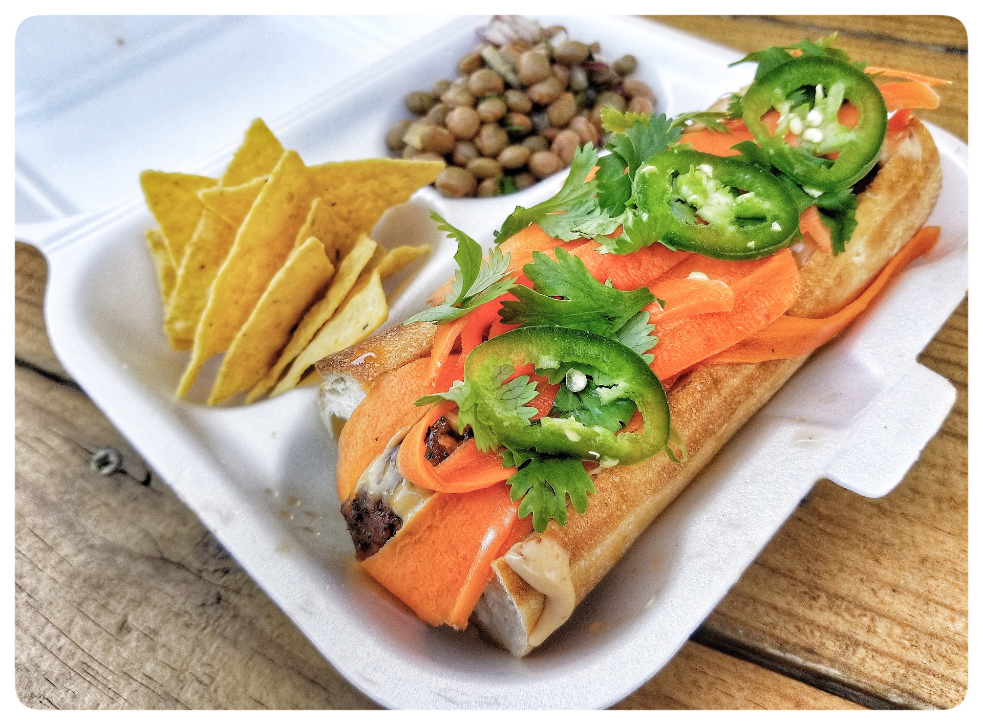 I had what was a take on a Banh Mi, which is a sandwich typically served in Vietnam. The sandwich came with 4 juicy meatballs topped with a nice home made aiole, veggies, pickled carrots, cilantro and jalapenos. This sandwich came with a side, which you can choose 1 out of 3. Mac n cheese, chickpea salad or Lays chips. I chose the chickpea salad which paired well with the Banh Mi and it also came with tortilla chips for some odd reason. Regardless, the sandwich was well prepared and tasted great. The meatballs were pretty tender and seasoned quite well, but once the marriage of vegetables and pickled carrots and the picante jalapenos fell into the grasp of a fresh supple French bread, this became a big joyful sammich which made me happy and a...