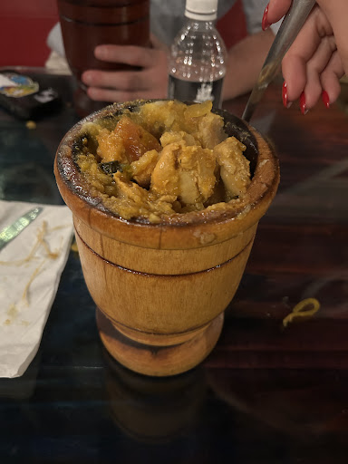 I ordered the pollo yuca mofongo with creole sauce, and while the presentation was unique—served in tall wooden gourds—it made actually eating the dish frustrating. The mofongo spilled out every time I tried to scoop a bite, and the height of the container made it difficult to eat without a mess. No plates were provided to catch the overflow, so I found myself fighting with both the food and the presentation.