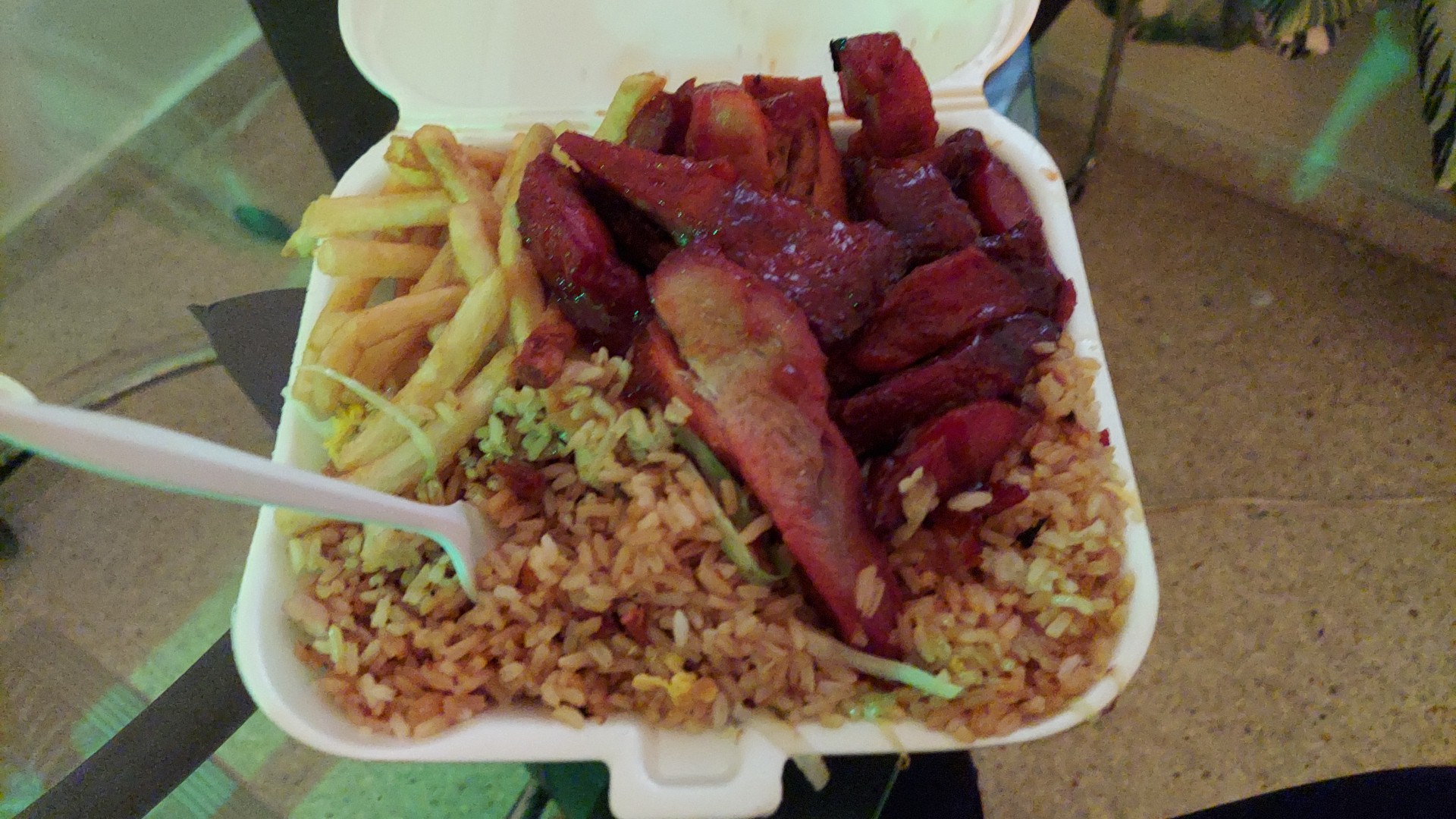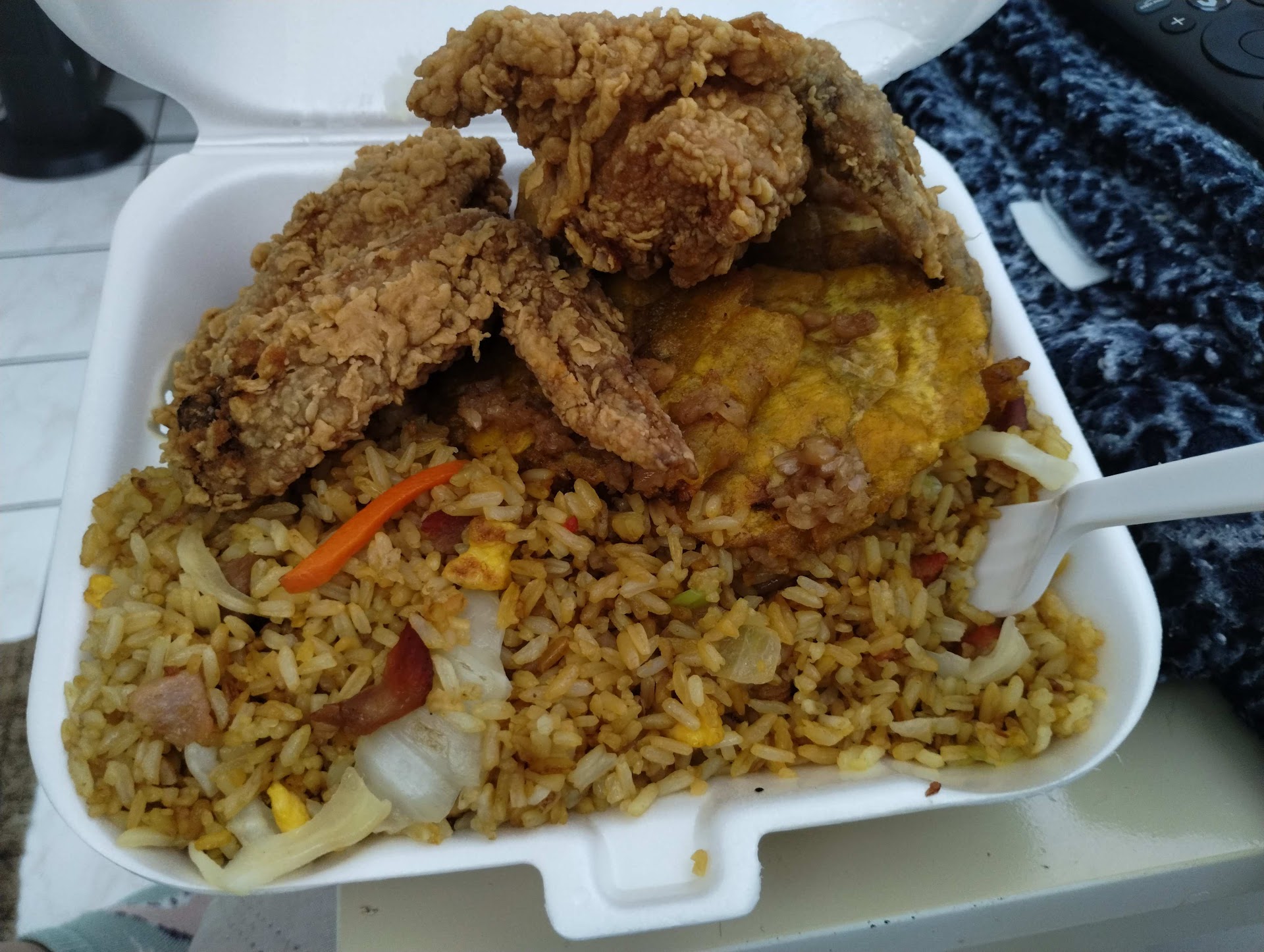 I haven't been to PR for over 15yrs, and I surely missed puertorican Chinese food. I order the chicken wings combination with tostones. 3 wings with fries and a 2 piece chicken with fries. 3 large wings, funny she told me "son chiquititas" but man they were huge. The chicken was delicious but greasy, each bite a drop of grease would drip down the side of my mouth. Is a good thing that I don't eat like this every day 😆 the rice was not salty it was just right enough if you wanted more salty, just add soy sauce. There is no shrimp in the rice. The fries were freshly fried hot and crunchy. And the give you 7 tostones con ajo. For these 3 plates...