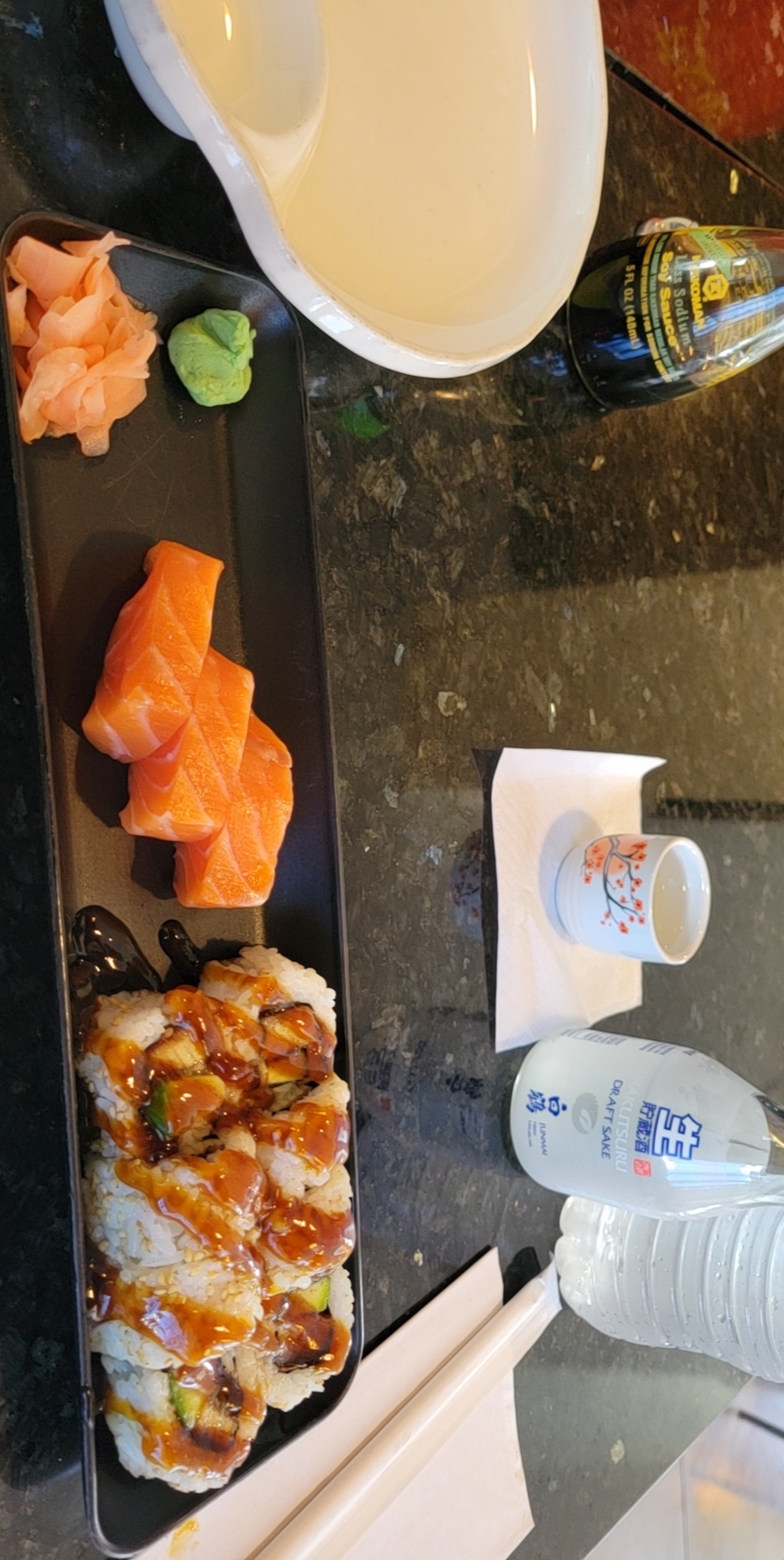Next, I ordered the salmon sashimi and an eel & avocado roll. The sashimi was alright but the eel roll was off. The sauce they used was not eel sauce which might be a choice on their part, the rice tasted like stale water, and the eel itself tasted off. The manager stated that it was not undercooked since they used previously cooked eel from a bag and then they microwave it for 30 seconds to make sure it's cooked all the way. Regardless, the product I received tasted like it was either spoiled or undercooked. I did not eat more that that initial bite.
