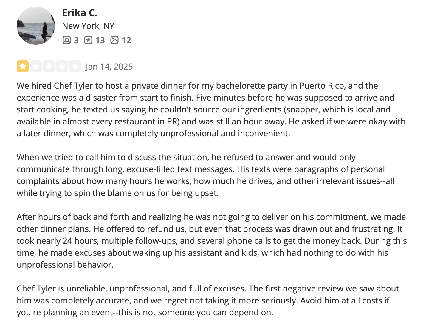 Read moreNo stars. Reached out to Chef Tyler last week via phone and website to book him for my bachelorette trip to PR in May and got no response. My maid of honor reached out a week or two before then to get a quote and also no response.