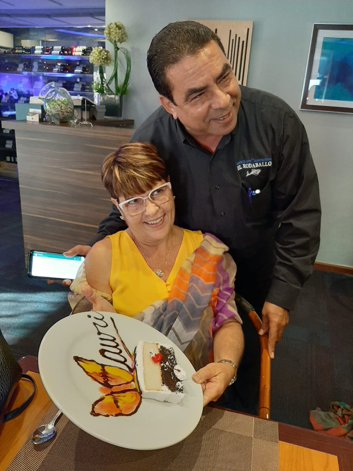 I went to El Rodaballo in my Happy Birthday's celebration last January 28 with the closest friends. Was our first visit to this excellent restaurant. Great choice. We asked for red sangria. Very good taste. The food was great and tasty. Two of us asked for casserole of codfish with gandules, Avocado and lettuce salad. Another tries groupers chunks with breadfruit "tostones", other one seafood paella and myself large shrimps ( langostinos) with breadfruit tostones and green salad. All the portions were huge and the prices are fairly. The service was extraordinary. All waiters were attentive and helpful. The birthday cake was accompanied by waiters and they sang happy birthday to me!! One of them (sorry for not asking his name) decorated my plate with a butterfly and my name! I asked Chef José Danilo Gonell if he could take a picture with me because I spent a grateful time there....