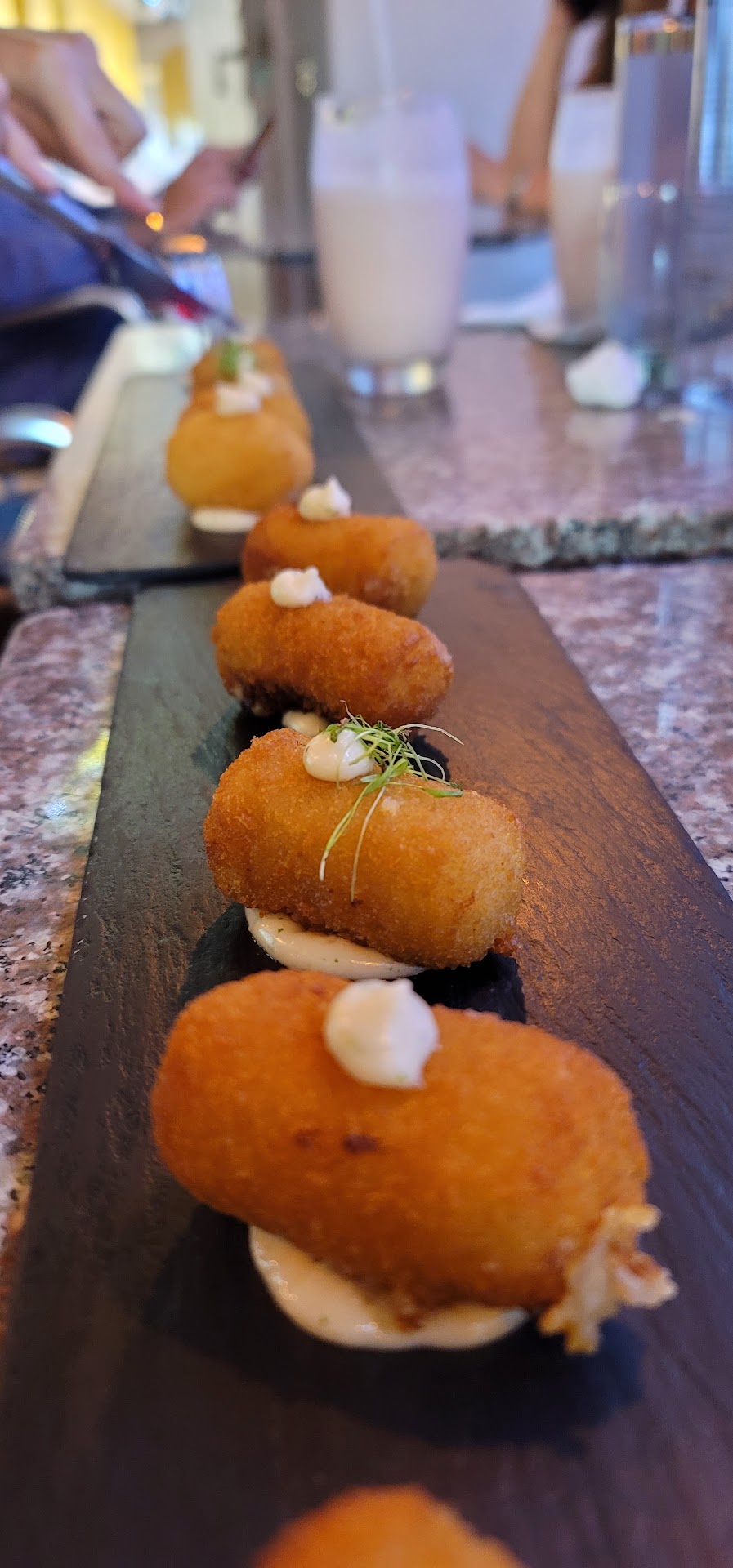 Appetizers were croquettes. The codfish ones were not salty as we feared. The manchego cheese were a bit more so. Both delicious!!