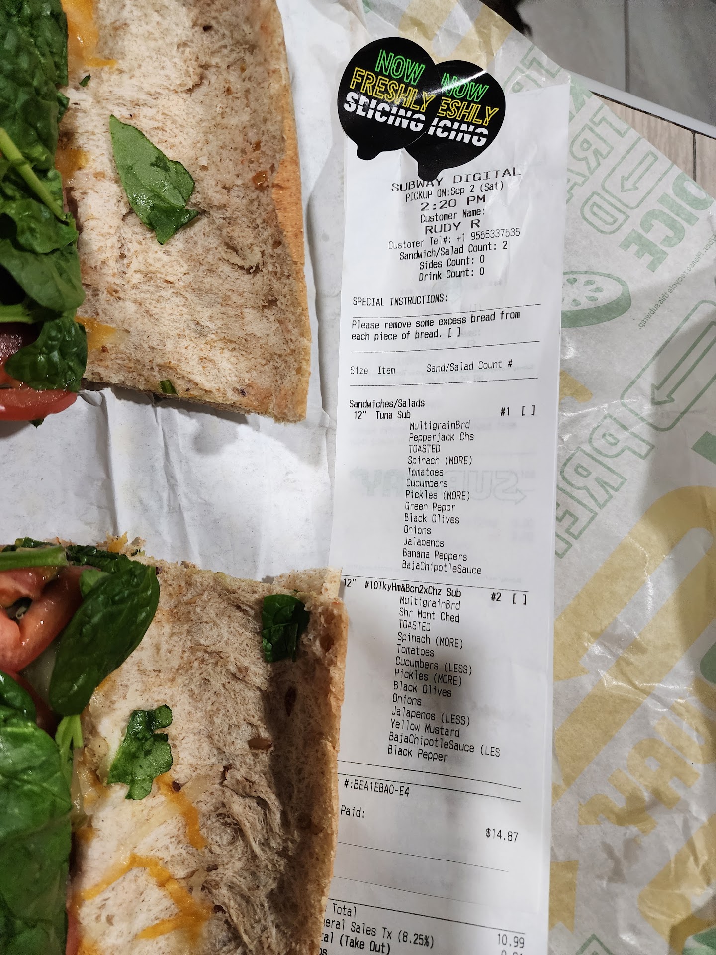 I ordered two 12" standard turkey sandwiches, one with deluxe meat and bacon... the other with extra cheese and bacon. These sandwiches are around $11 before the extras, around $15 once added. And that's exactly what the screen reflected when I ordered it.