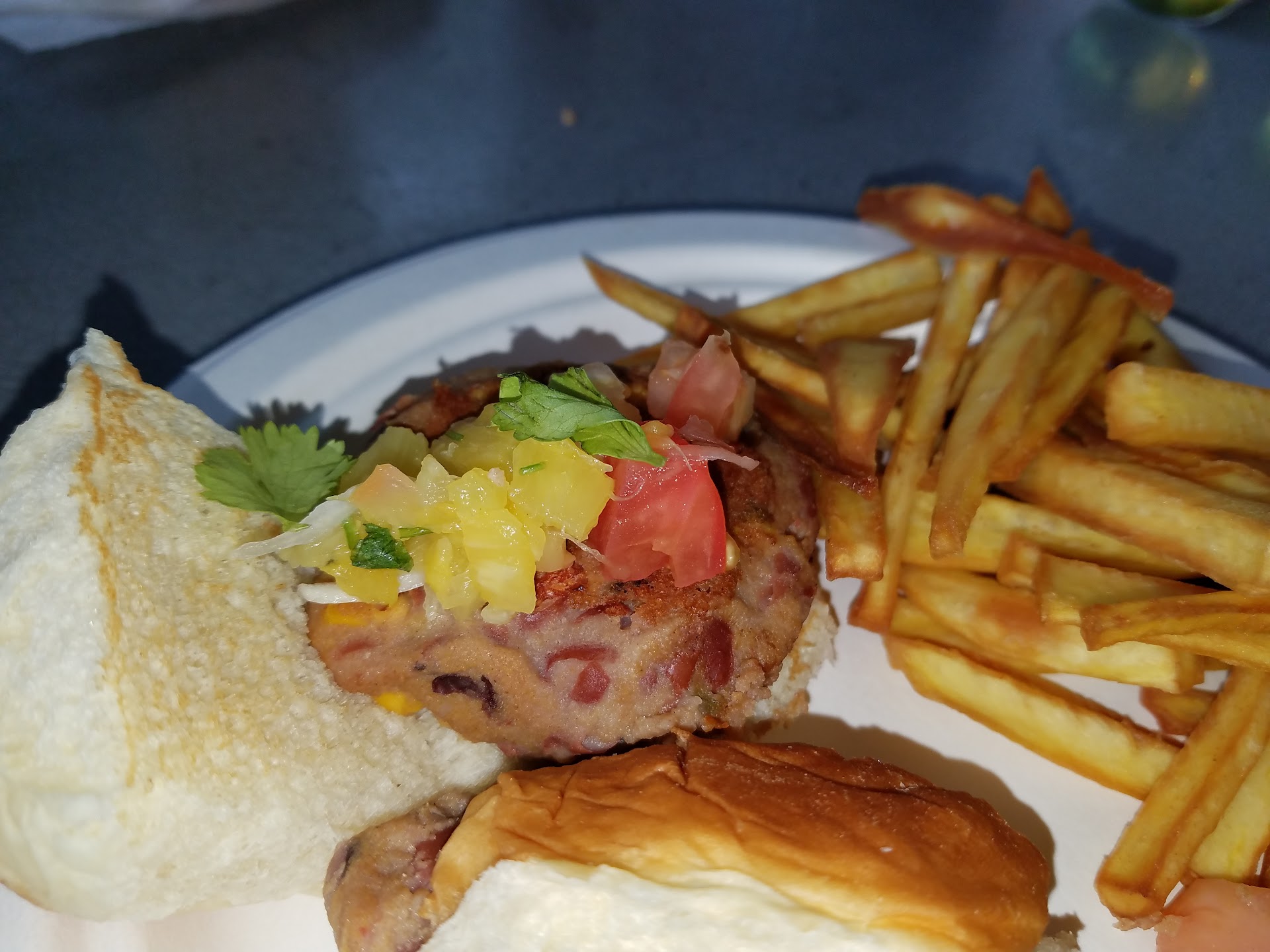 The last time I went back two days ago and I am never going back again. It was a day where there was a large soccer game on the TV outdoors but it was not a busy day for them. The two servers on the floor tables were young guys who did not seem to understand customer service (and I am aware it lacks in the island). However this just added to the previous experiences there. I went back to ordering my poke bowl because it can't fail. But my mom ordered a bean burger and was saddened by the all around taste and presentation. The beans were from a can that was partially mashed, formed into a ball and lightly seared on a flat top with about twenty seconds each side. So there was absolutely no structure to this burger, just mush. It also had the dime size squirt of sauce, no flavor. They put two cilantro leave and again two dices or tomato and a few pineapple pieces. Not once did the server ask if the meal was going alright or if we wanted refills on drinks. We got up a few times to get our own napkins and sauces. The servers were busy socializing and watching the game on the screen. My mom informed the server of the quality of the meal just as advice to share with the chef. Thankfully when I asked for the bill this time it was brought promptly. End of meal.