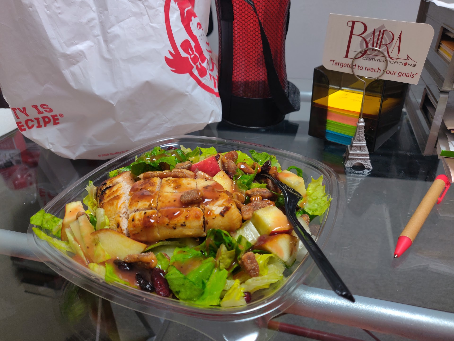 The drive-thru was busier than expected but after 3:30pm. I order an Apple Pecan Salad. It took a while cuz it was a long waiting line. When I picked it up, I asked if everything was there. She said yes, so I continue my way out. When I open the bag, the salad didn't have blue cheese, which is included in the ingredients right before the chicken... As mentioned in their website: "Apple Pecan Salad Made fresh daily with Wendy’s signature lettuce blend, crisp red and green apples, dried cranberries, roasted pecans, crumbled blue cheese, and grilled chicken breast hot off the grill, all topped with Marzetti® Simply Dressed® Pomegranate Vinaigrette. An unbeatable pick". Also, they just gave me a fork, and no knife, even though the chicken breast wasn't...