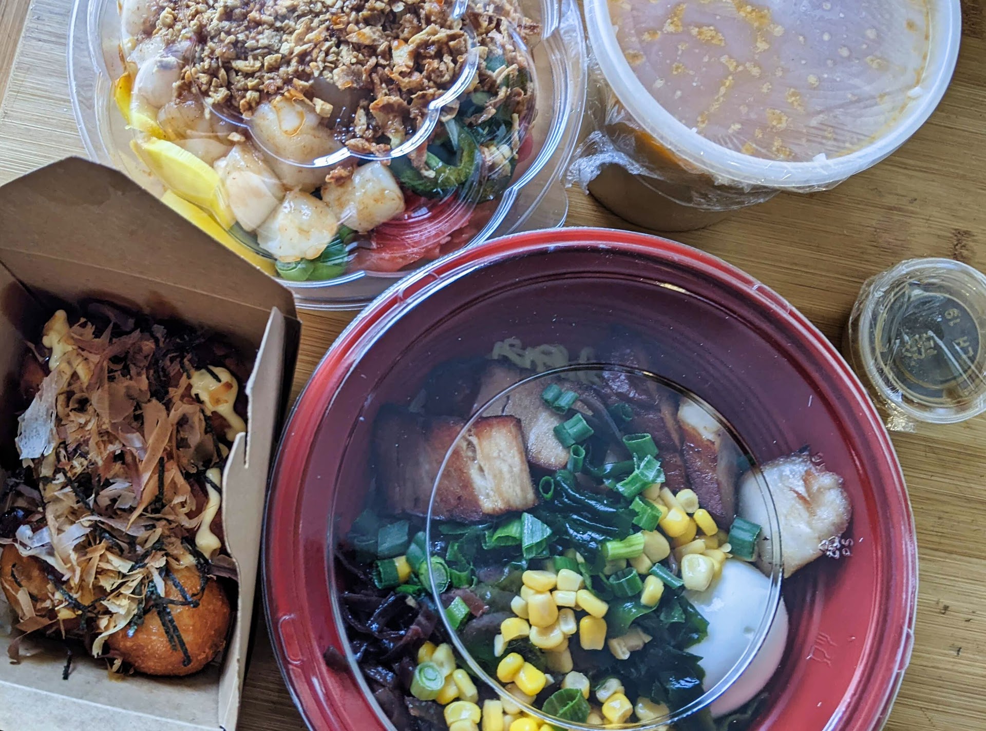 Poke (Salmon and Scallop): I specifically ordered this because old or spent-too-long-in-the-freezer scallops are pretty distinctive. I was pleased to find the fish was very fresh! All the toppings were a delight, and their spicy poke and wasabi ponzu were delicious. They were able to accommodate my ask for the ponzu to be on the side. My only complaint (and just barely) was that the rice was very slightly underseasoned, but that being said it tasted fresh, was not dry, and had a perfect texture. I was able to just add a little soy sauce and everything was good to go.
