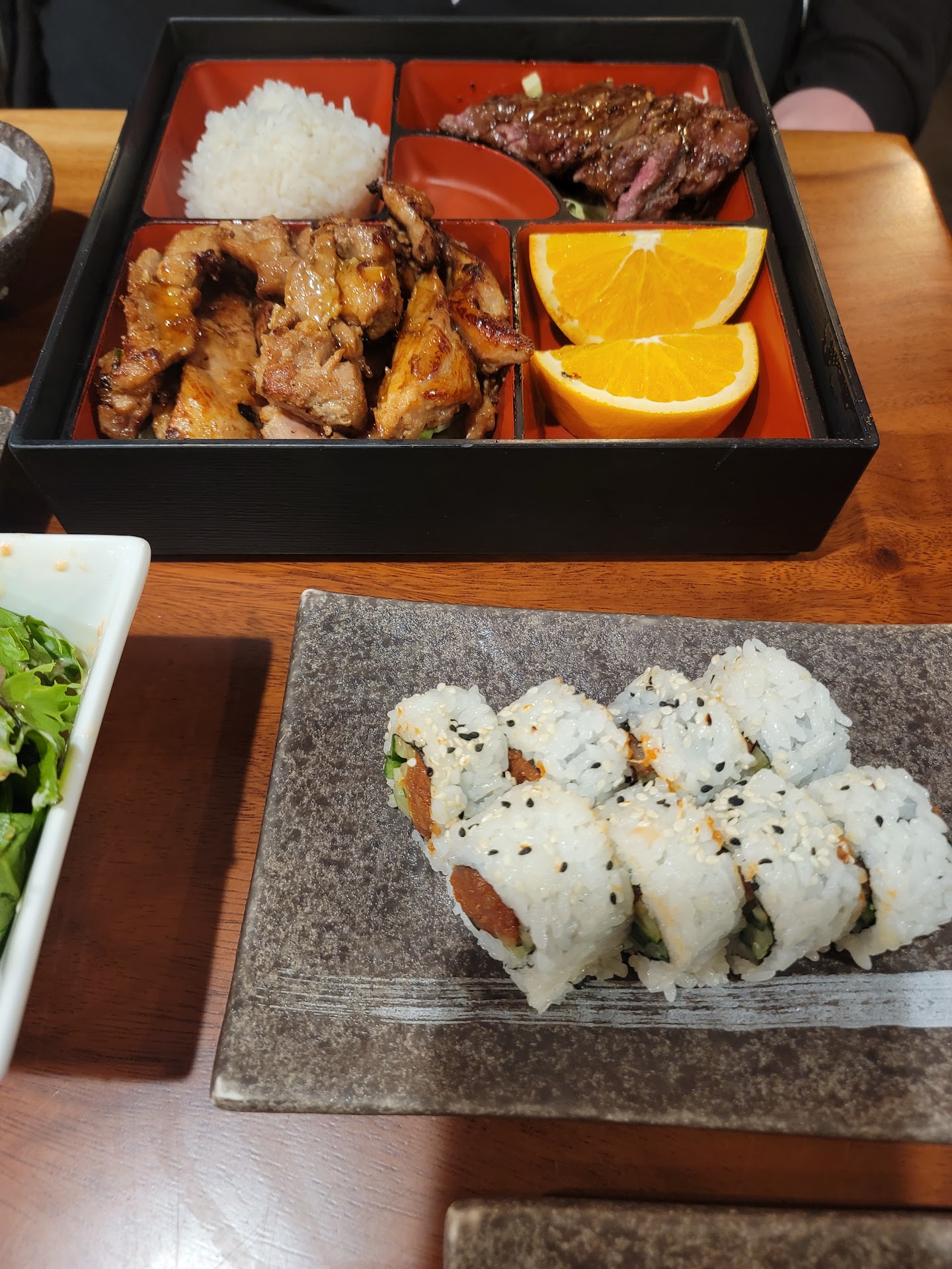 Cons. We got our salad and soup fast. Then after 2 of my rolls of 3. And my brother beef and chicken teriyaki. But the last roll took 20 plus mins to get to us. A communication should of happen on the time. The design on the 3rd roll is beautiful and amazing. But, that's all it's good for. The roll was over cooked and didn't tell you what was in it. Just stating. Mix fish. Just give explanation of what fish. That's a misleading thing there.