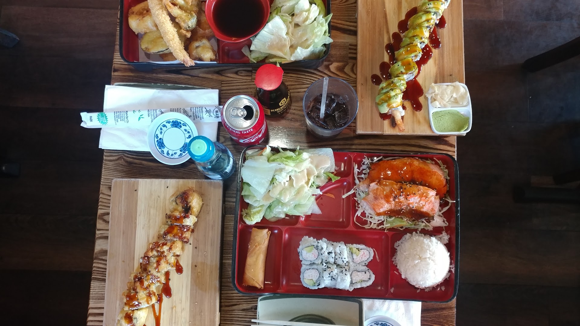 I had the chicken terryaki dinner (w/soup and rice - supposed to be w/salad too but I did not mark off for not getting it. I was full after the terryaki, it was a huge serving (really for two), brought over in a hot-plate. I also had maguro/ahi-tuna nigiri, two pieces of fish on rice (which also was excellent tasting) but the ahi was sliced a bit thinner than most nigiri but at $5 for 2-pc. nigiri, this is reasonable. I was also jones-ing for soft-shell crab and got the Spider-roll, which was also excellent. They also sell the soft-shell crab as an appetizer.