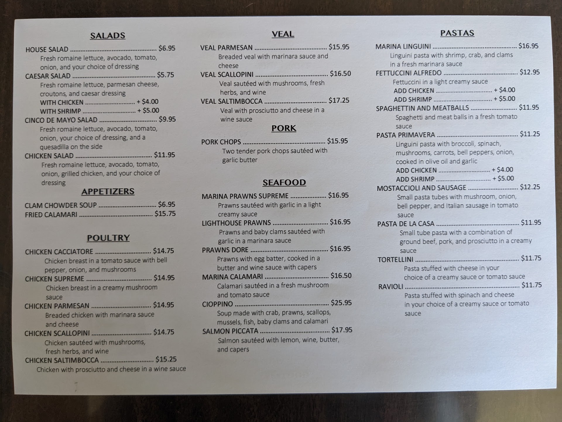 Read moreWow and Wow. Was staying overnight at the Marina Inn and searched for a place for dinner. Fortunately, I chose a winner with Marina. My wife had an Italian Chicken Dinner and I had a Mexican chicken dinner. Also ordered a bowl of clam chowder. Everything was excellent, fresh, delicious, and plentiful. We got takeout as currently there is no dine in option. As I mentioned, plentiful was an understatement. We were packing for a flight and had a luggage scale out at the hotel. Our two meals with soup actually was right at 7 pounds of food and unfortunately, more than we could possibly eat. I don't leave many reviews but love to shout out a clear winner. 6 days around northern California with great meals everywhere. This one stood out and is...