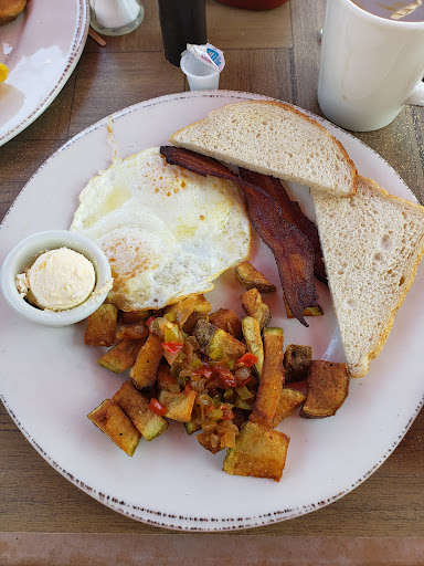 Visiting SLO, I stopped into the Apple Farm Restaurant on 12/2/2021 for breakfast. Itās counter-service, and for $18 plus tax and tip, I ordered two eggs over medium, sausage, sourdough toast, fresh fruit in lieu of potatoes, and coffee.