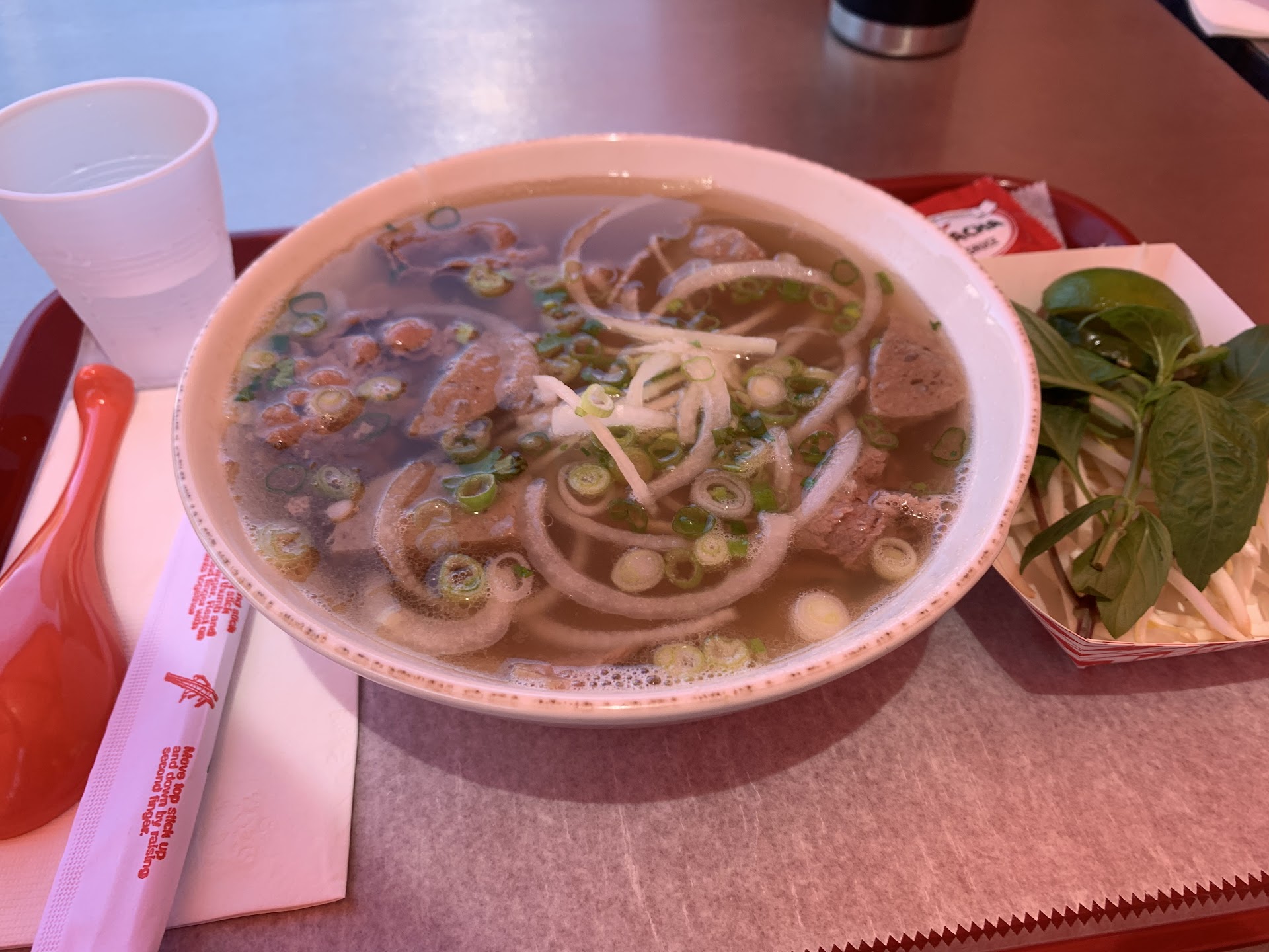 I ordered a beef pho. It was in the typical price range, about $16-$17, which was good, so I thought. It came out hot, with some sauce and vegetables on the side. I’ll start off with things I enjoyed: the soup was up to my standards. That’s kind of it. The noodles were small, the meat was too cooked for my tastes, I didn’t like the vegetables, and the sriracha was offbrand and didn’t taste good nor was it as spicy as I’d hoped. I’m used to Vietnamese restaurants having those bottles of branded sriracha at every table, so having to ask the front for more sriracha packets at the front was unsual. I couldn’t finish my pho. I usually bring my leftover pho with me, but I no longer had an appetite for it.