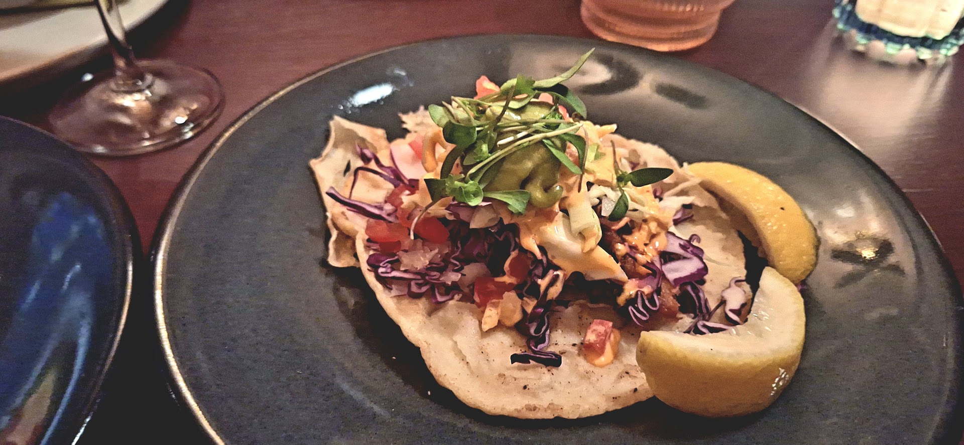 We went to the new bar/restaurant that opened next to the Petit Soleil and everything was delicious. We tried almost all the food items and loved them. Forgot to take pics, but the guacamole with chicharron was incredible and a good size for the 4 of us to start with. We also started with a Strawberry bitter margarita boozy slushy that was not sweet and full of flavor! My new summer drink! My friends had a Oaxacan OF that was fun and balanced with really cool custom ice and a Mezcal Negroni! Then we dove into the Tacos and we all loved the Baja fish taco & the Taco Pulpo Ajillo. The ceviche was light, fresh and exactly what you want from a ceviche. The Aguachile verde de Pulpo was really delicious as well and a crowd pleasure at our table. We had a second round of drinks and I'm singing the praises of the Jaguar Moon cocktail and my friends love the Mango Daiquiri, which is beautiful and bright and tasty. We tried the Esquites which was like a soup, not heavy, unique and full of flavor. Very different, and will be getting this every visit! The decor is stunning and the perfect night out vibe we needed. You can see the attention to detail from the design, back bar and intrigue cocktails. Great hospitality! This will be on our weekly rotation whether we are swinging through for just drinks or dinner out. Oh and highly recommend the espresso martini called a Carajillo! Lot of street parking available and open till 11 nightly. Free parking is nice to have in downtown SLO. Lastly I'm gluten free and could eat almost everything on the menu which is...