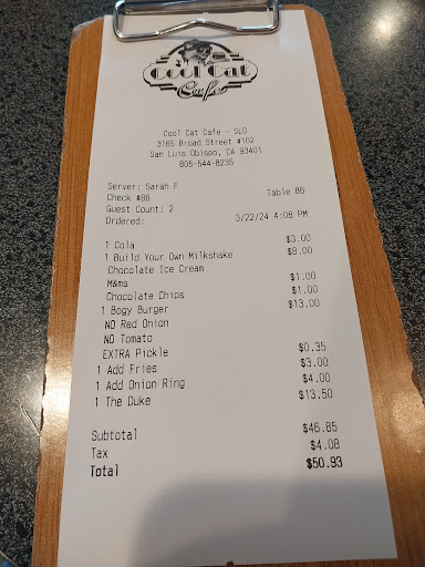 Read moreI had a very nice meal here today where all the standards of an excellent diner were intact. Attentive service, a great kitchen staff, perfect fries, a good, honest perfectly cooked "Don Ho" burger and the all-important iced tea. It can be snobbery for sure but in an age where Heinz ketchup in a glass bottle is going the way of the payphone, it's nice to still see them here (it's sort of my litmus test). Visually, Cool Cat Cafe one of those 50's nostalgia places tucked into a typical vanilla strip mall -- call me crazy but I'm beginning to think that places found in these strip malls are some of the best in the country. Overlooking the kitsch, at the core Cool Cat Cafe is a better "diner" than a few other institutions I could name in SLO. It's nice to see amazing service and people who you can tell are enjoying the work day, not dreading it. San Luis Obispo increasingly seems to be the place where it's hard to find a burger for under 15$ in the downtown area so I'm thankful there is a place not far off where I can spend less than I would at the Five Guys (including tip) and provides the experience I want -- to just sit at the counter, read something and enjoy the...