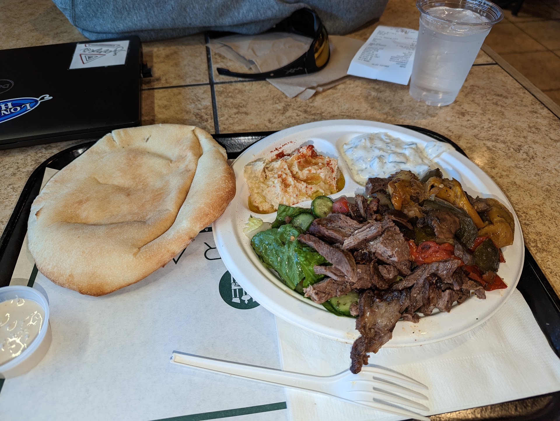 First bite, good but not incredible. Second bite was a piece of pita and a dip in the hummus. The hummus was a little bland I'd say, but I love all kinds of hummus so I kept eating. Third bite was salad and meat. I did the split tray where I had partial meat and partial grilled vegetables. The grilled vegetables are absolutely dynamite. The meat was good. The hummus remained underwhelming. I've definitely had better hummus. In fact I would call a trader Joe's hummus much better.
