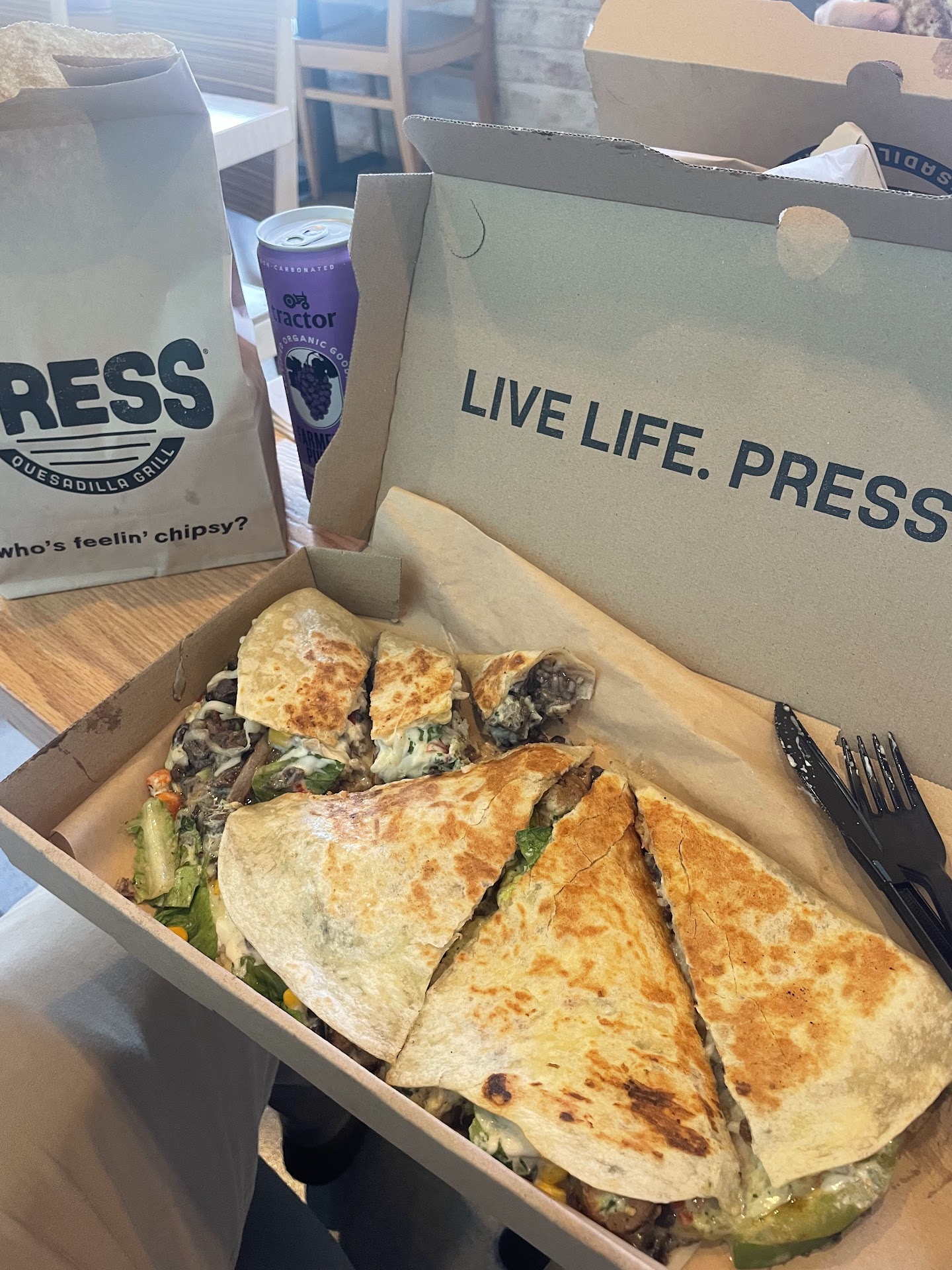 They have the same proteins as Chipotle, with four different kinds of delicious sauces. We ordered the quesadilla, and it was huge, tasty, crunchy, and served in a nice recycled box.