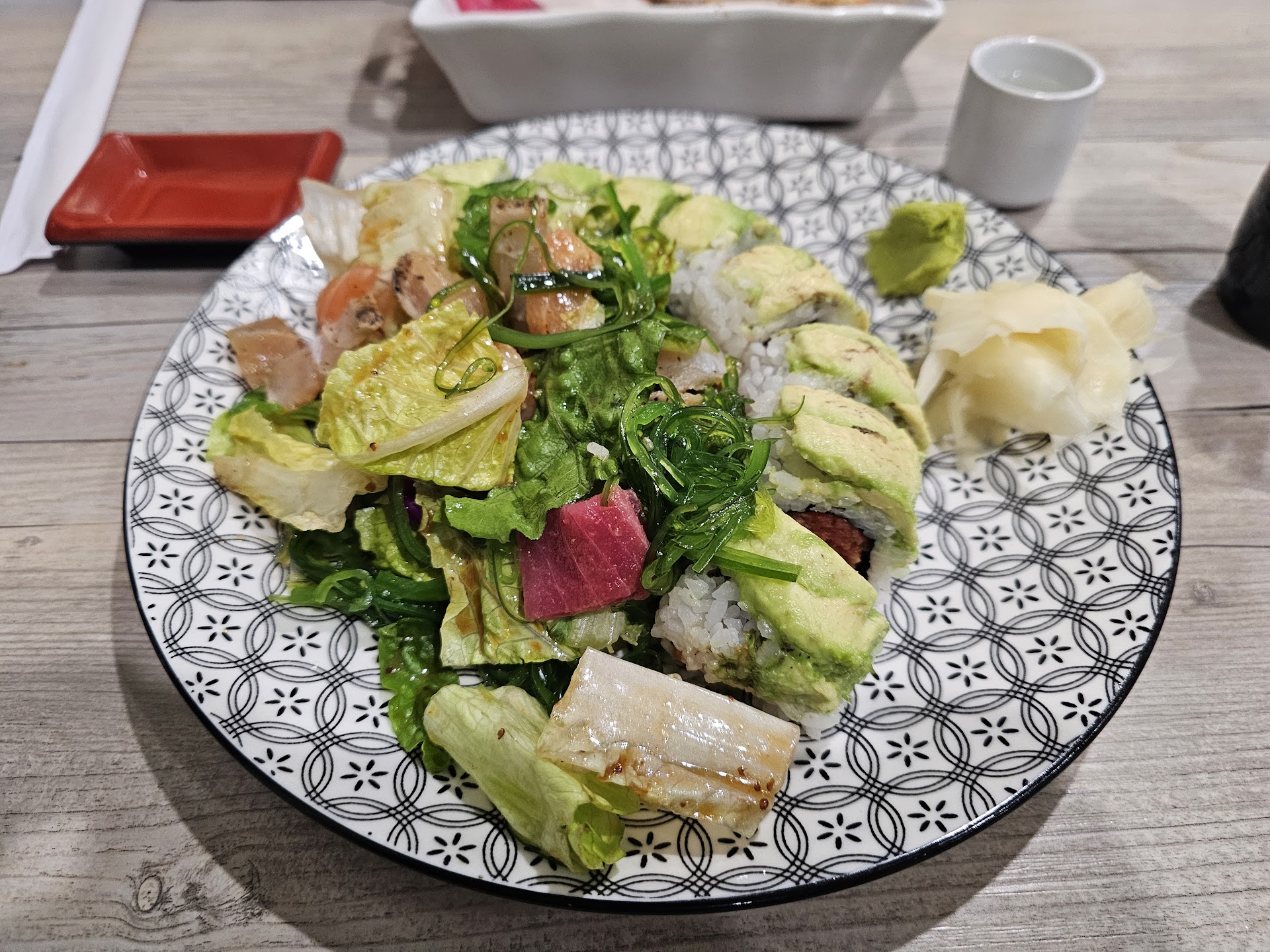 Great prices that gets you a butt load of food without breaking the bank. They have a solid 50% off Specialty Rolls menu if your total is over $15. Lot's of rolls to choose from, great variety, interesting/fun names, and great combinations. Super Dragon Rolls was exactly what I wanted. Large pieces, generous toppings, super really filling. Great for sharing! The Lunch Specials are a great deal with lots of food. This is good to order when you're hungry and want a variety. I don't recommend the beef teriyaki or the sesame chicken because both were dry, albeit the generous amount of sauce. Tempura here is SO GOOD. Not soggy, great crisp, and large pieces. CHRIRASHI BOWL! For about $22, this is SO WORTH IT. It's not mind blowing, melt in your mouth sushi but it was fresh, generous, and great variety of fish. The sushi rice was perfect. Dim and dingy interior that feels like a cave Spacious dining area with plenty of seating. We didn't have any problem getting a table Friendly, fast service that was always attentive without hovering Convenient location for running errands in the neighborhood Easy parking in a large...