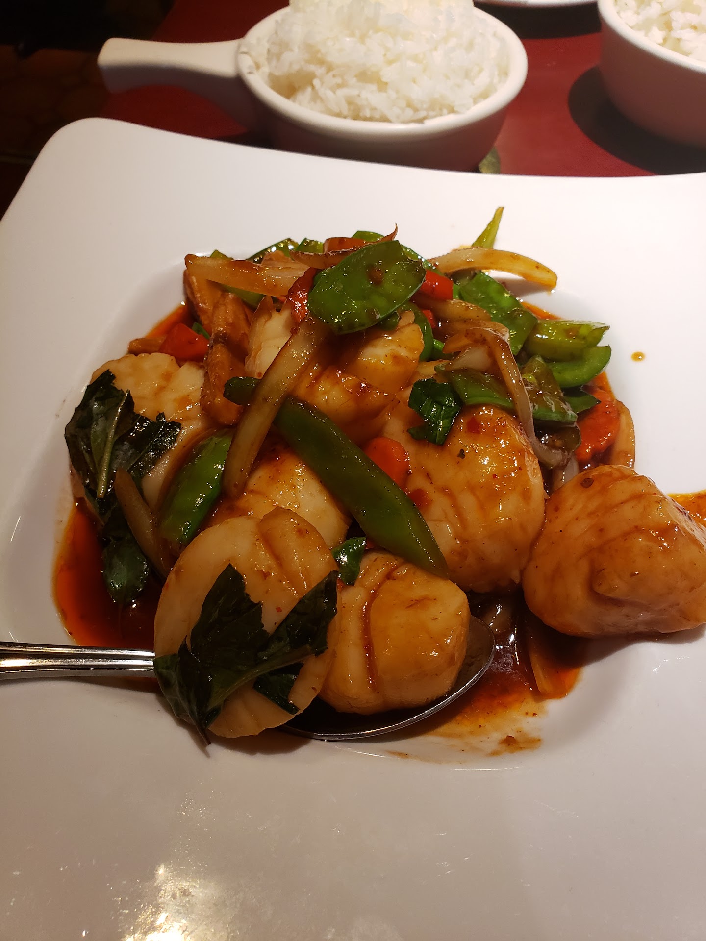 I had the Scallops under the "chefs favorites" section. I must say, Inwas expecting maybe 4 moderate size scallops at the most. They scallops were HUGE and therebwas at least 8 of them. They were cooked perfectly, nice and tender and not rubbery and definitely not fishy tasting. The sauce they were in was moderately spicy but it was the perfect touch. It had basil and some veggies mixed in. Along with it comes your choice of white rice, brown rice, or steamed vegetables.