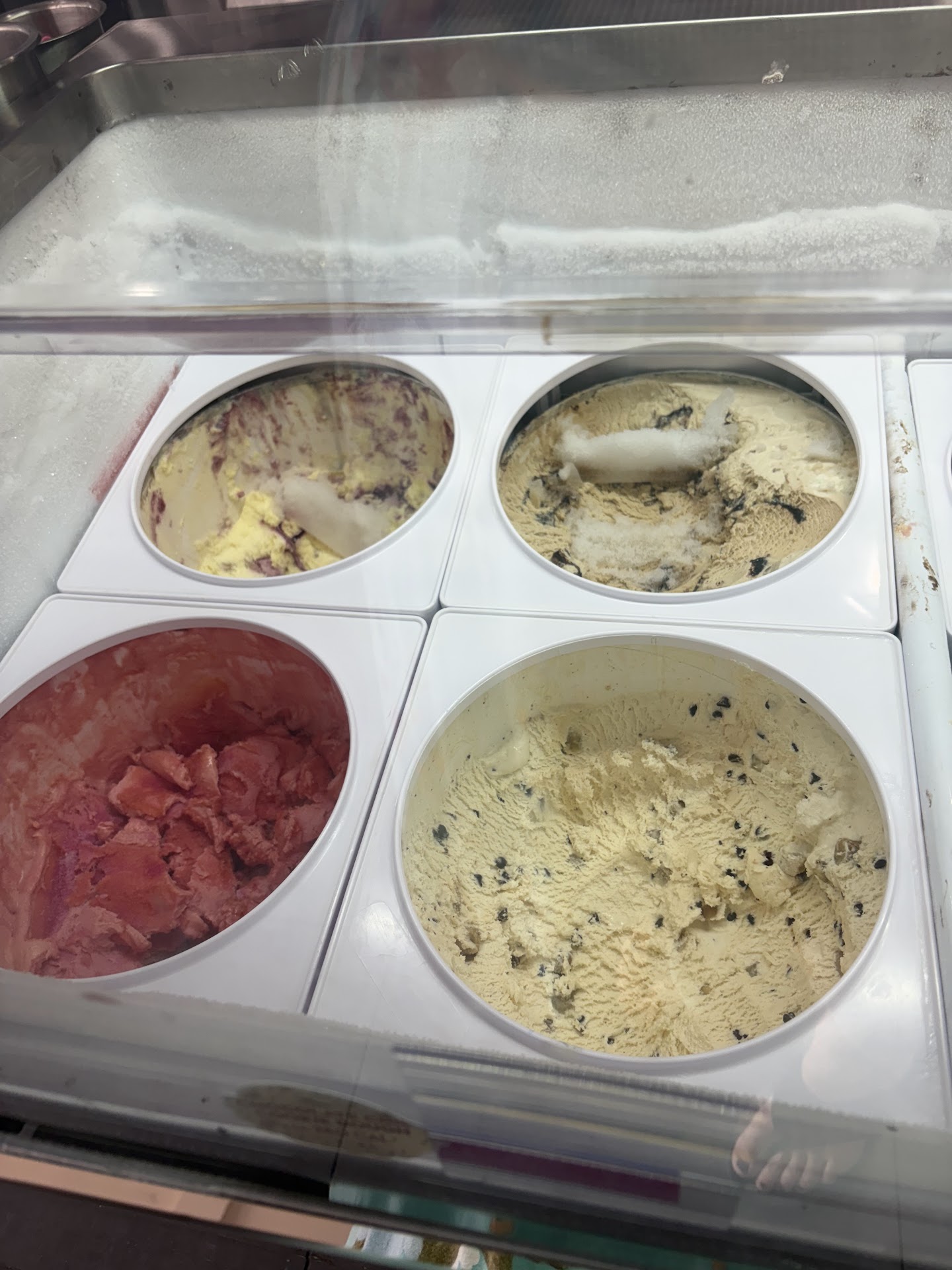 Once I noticed these large discolored chunks of ice in 3 of the ice creams I asked the lady if it happened often and she just chuckled and didnāt respond and proceeded to pick out the chunks of ice and asked what kind we wanted.