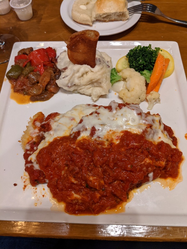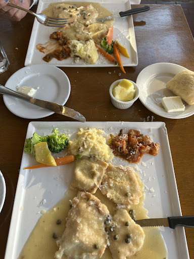 Although the specials sounded amazing, who couldn’t resist fried mozzarella, because we didn’t want leftovers, we decided to split the chicken piccata with spinach, ravioli, mashed potatoes, vegetables, eggplant.