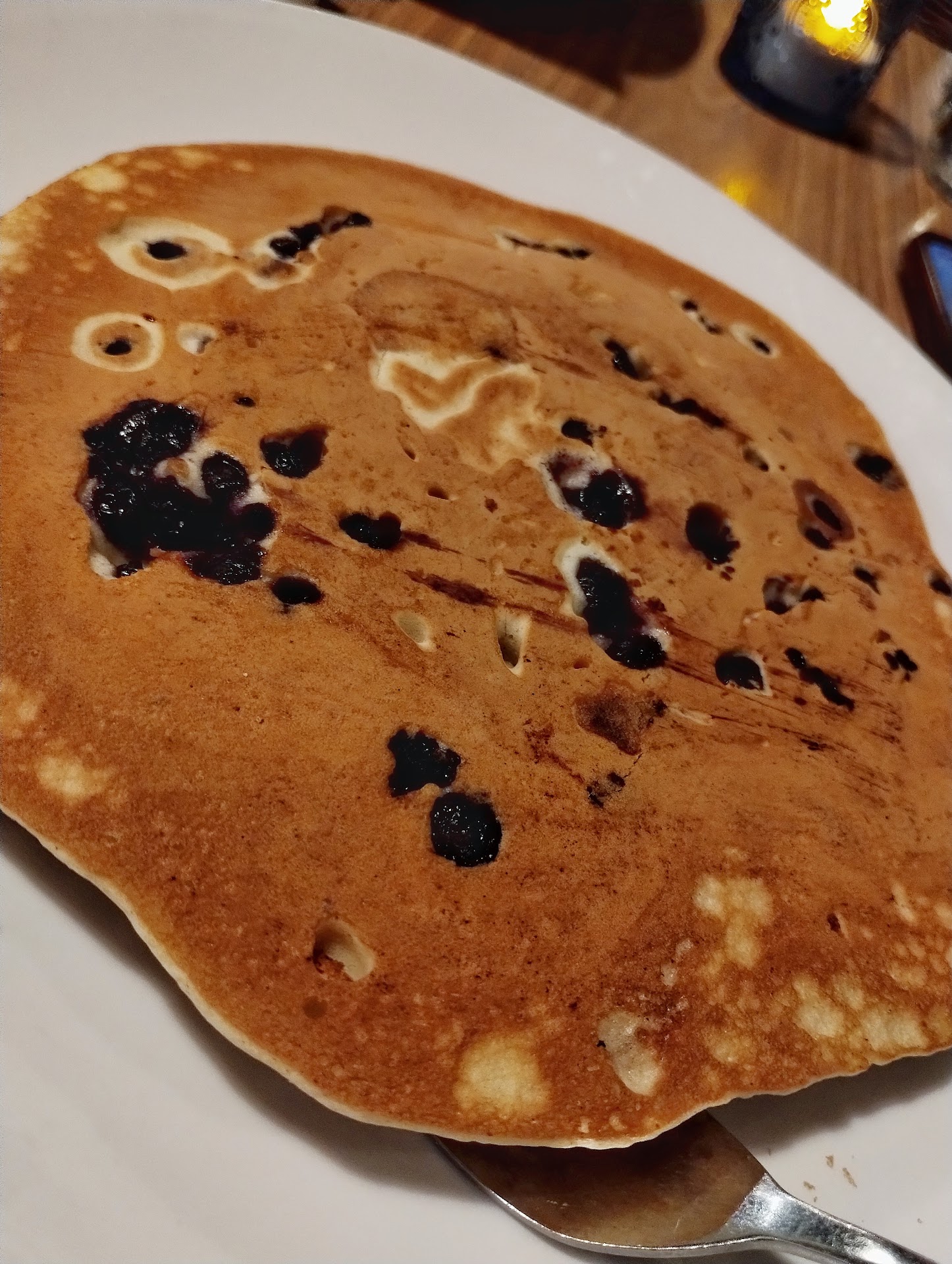Then suddenly, a waitress (not our waitress but a different one) comes over with another plate of blueberry pancakes and we were confused and were like "no, must not be us because we already have our food". A few minutes later, the MANAGER (Sam) comes out with a take out container with the blueberry pancakes inside. He said the waitress noticed that the pancakes I received were not up to their quality standards, and the manager had agreed with her so they made me two new blueberry pancakes and packaged them up to take home. Which, this absolutely baffled me because neither my husband nor I complained, or even said anything at all about the pancakes. We were blissfully munching away lol. Actually, I was fine with the pancakes but the manager said "no no, we can do better, we want to do better. So here's some to take home, and they're even good reheated too" ALL OF THIS without prompting.