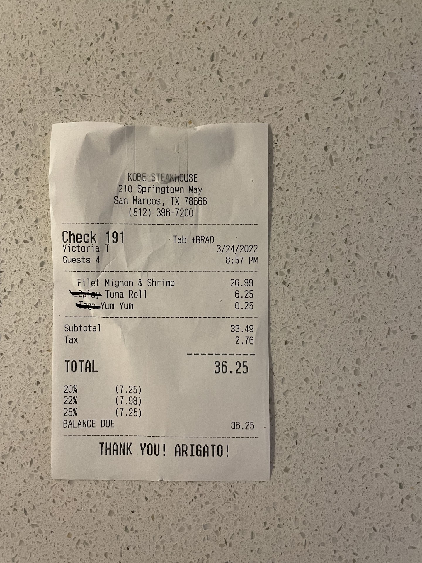 The waitress forgot the drink order, We got sushi with no side sauce soy sauce, no ginger no wasabi. We asked for to go boxes and had to wait 15 minutes for that before asking another...
