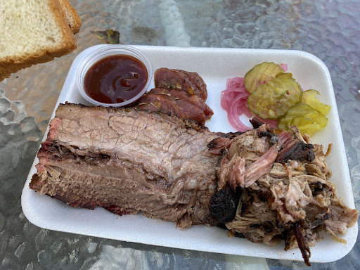 Absolutely some of the best BBQ I've had in a 30 mile radius. We discovered this by visiting the awesome Riley's Tavern road house on New Year's eve, saw the reviews were solid -- and I'm so excited we tried it! I was in a group of 6, he had plates out in about 10 minutes, and all of our eyes popped out as soon as we tasted it. When he says "legit", he means it. I had the meat sampler with brisket, pulled pork, and jalapeño cheese sausage -- and all three were out of this world. Ate with and without sauce, both supremely satisfying. A rare wonder! Riley's is awesome, this BBQ is awesome, and I can't wait to finish digesting so I can go back again!...