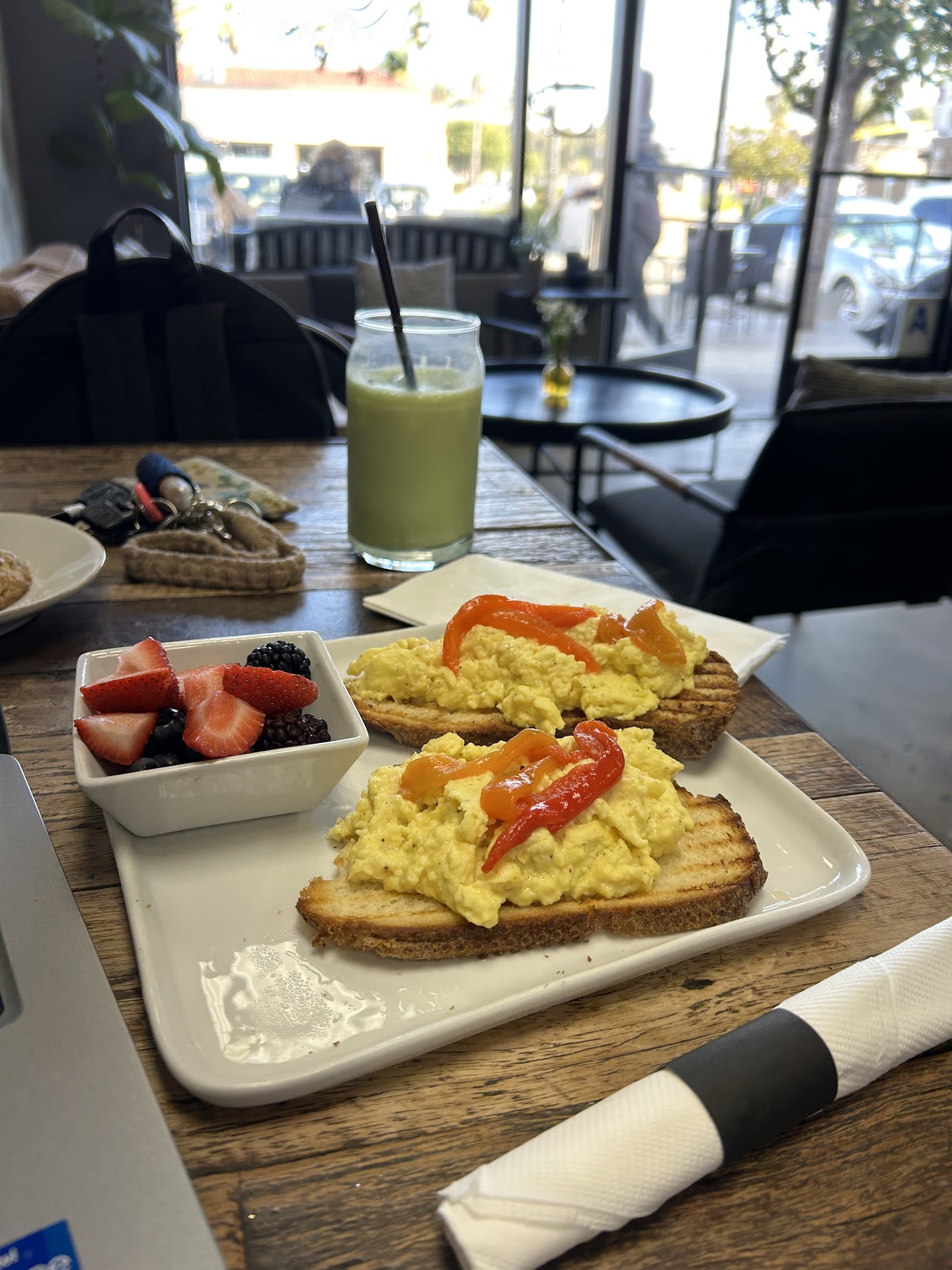 My wife got the poached eggs over toast. Presentation was nice though her comments were, " These poached eggs were definitely premade and then reheated. " Needless to say she didn't enjoy the meal.