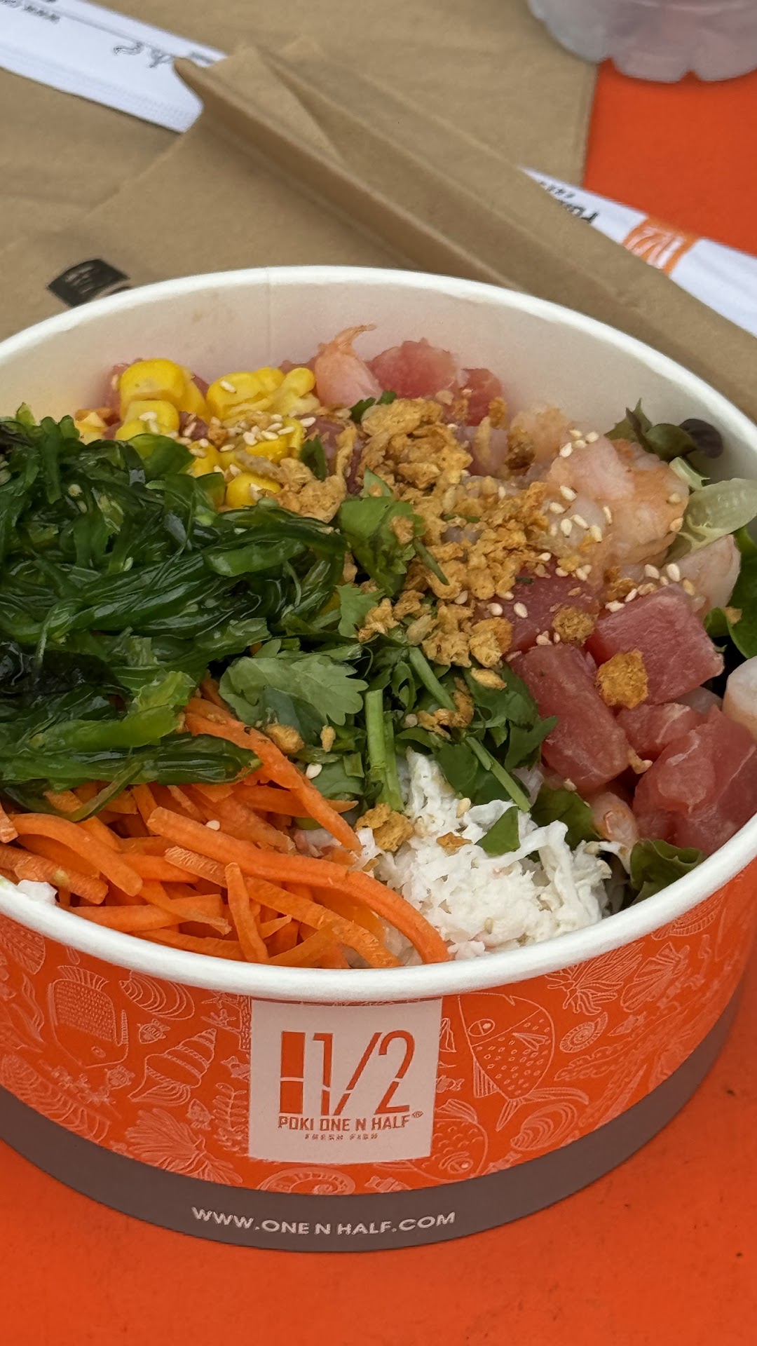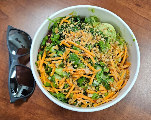 This spot is all about fresh seafood and customizable poki bowls. You can choose your portion size: Kid (1 scoop of protein), Small (2 scoops), Medium (3 scoops), or Large (4 scoops). I opted for the Large, selecting a mixed green salad base. Popular proteins like tuna, spicy tuna, salmon, Cali mix, and shrimp are complemented by options like tofu and diced chicken breast.