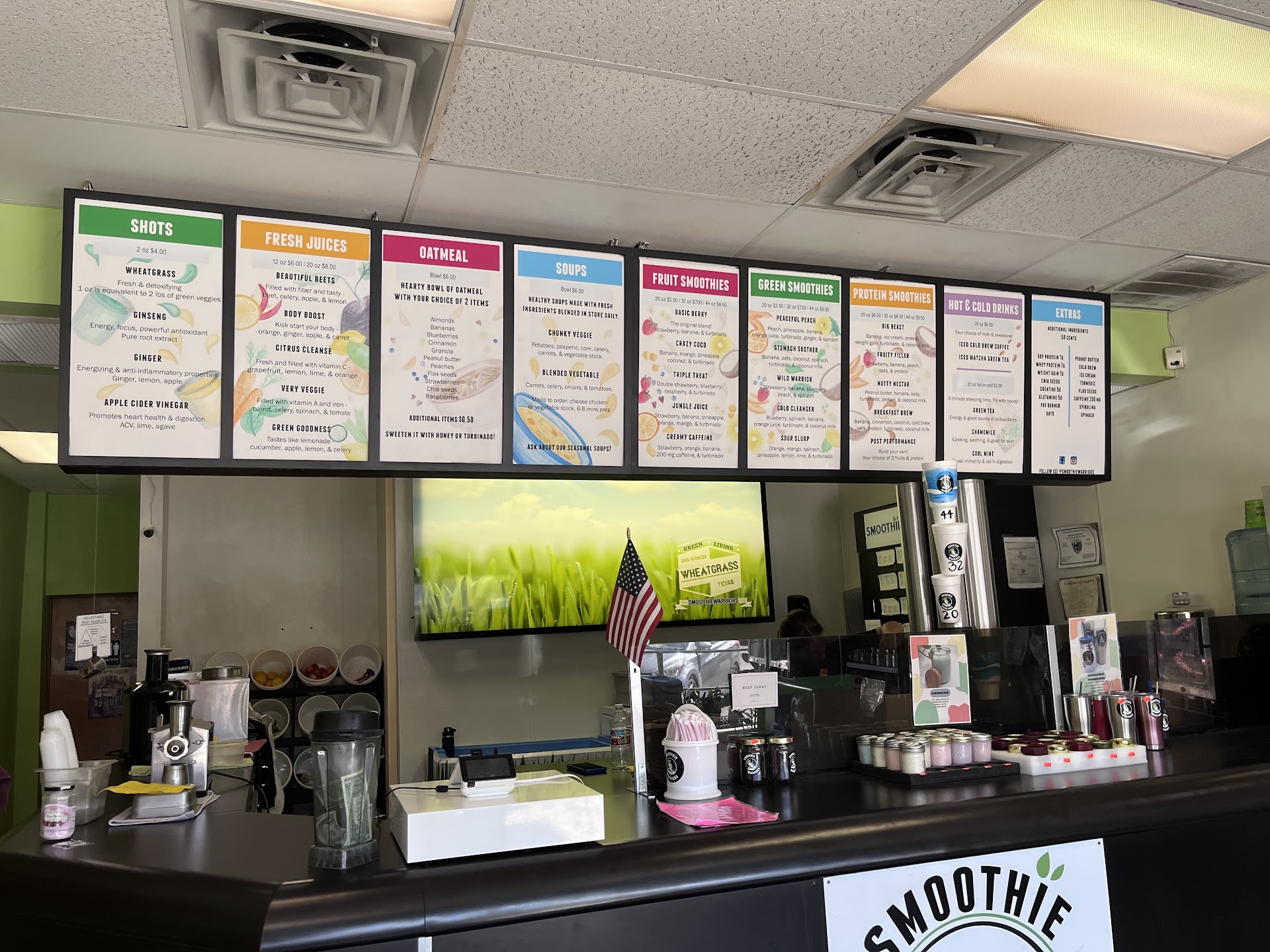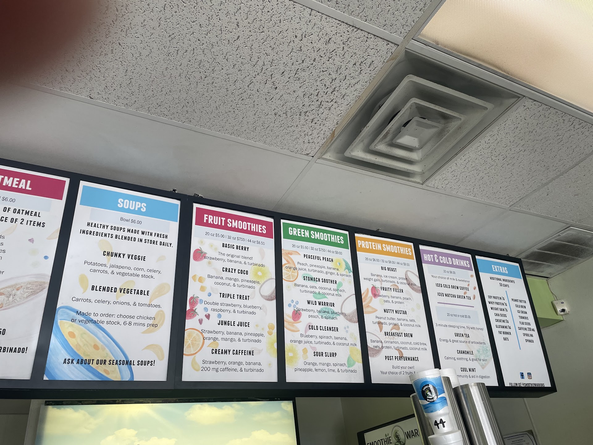 Read moreWelcoming atmosphere. Found Smoothie Warriors when looking for a locally owned business for a smoothie. The smoothies are made with real pronounceable ingredients. The small smoothie size is 20 ounces so you are not going to expect a normal small size and get hit with a toddler size. Don’t worry you can go up to 44 oz. Smoothie Warriors have 2 oz shots— this really made me happy since I really was looking for a shot place for times when I need a boost to immune system or energy. They have fresh juices 12 or 20 ounces, oatmeal, soups ( you can request chicken stock or vegetable stock) ask about the seasonal soups. They also have green smoothies and protein smoothies. They have other drinks hot or cold tea and cold brew coffee. Matcha. Bottled drinks also . They sell the plants that line the windows, they have homemade candles $3 & $10 . They sell homemade beef jerky in mason jars. There are mugs for sell, stainless steel tumblers and t-shirts. The walls are colorful but have a peaceful vibe. There’s no WiFi but they do take contactless payment like Apple Pay of course cash and card. Feel free to add to the tip jar. Everything on menu is made fresh daily. Loved the creamy caffeine fruit drink-strawberry, orange, banana. You can get a to go cup holder for multiple drinks if taking orders for your office, friends, family etc.You will want to come back. Refreshing...