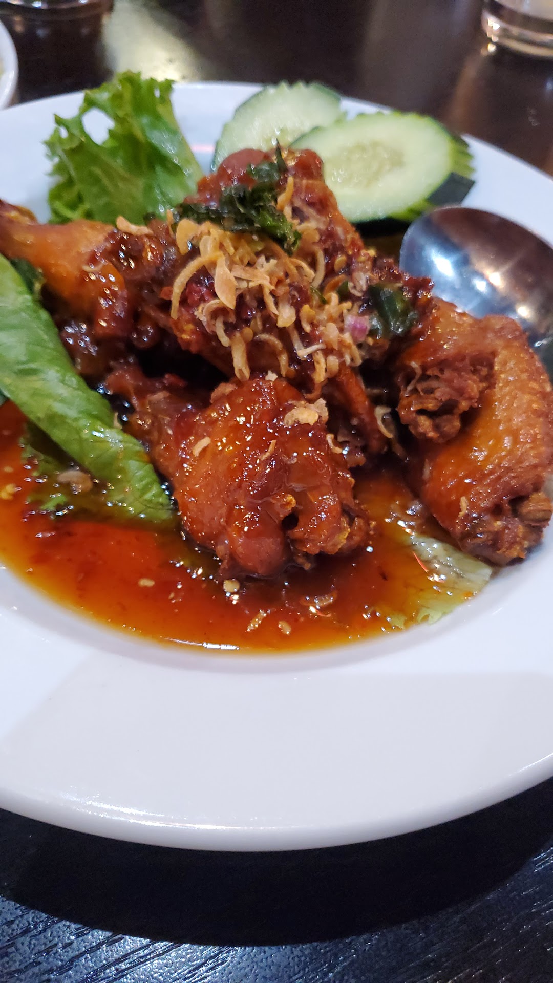 Angel wings was a bit on the salty side. It's marinated in tamarind sauce but tasted like it was overwhelmed with fish sauce. We tried to balance out the flavor with the papaya salad but it was a bit too salty for us. They were nice enough to not charge us for it.