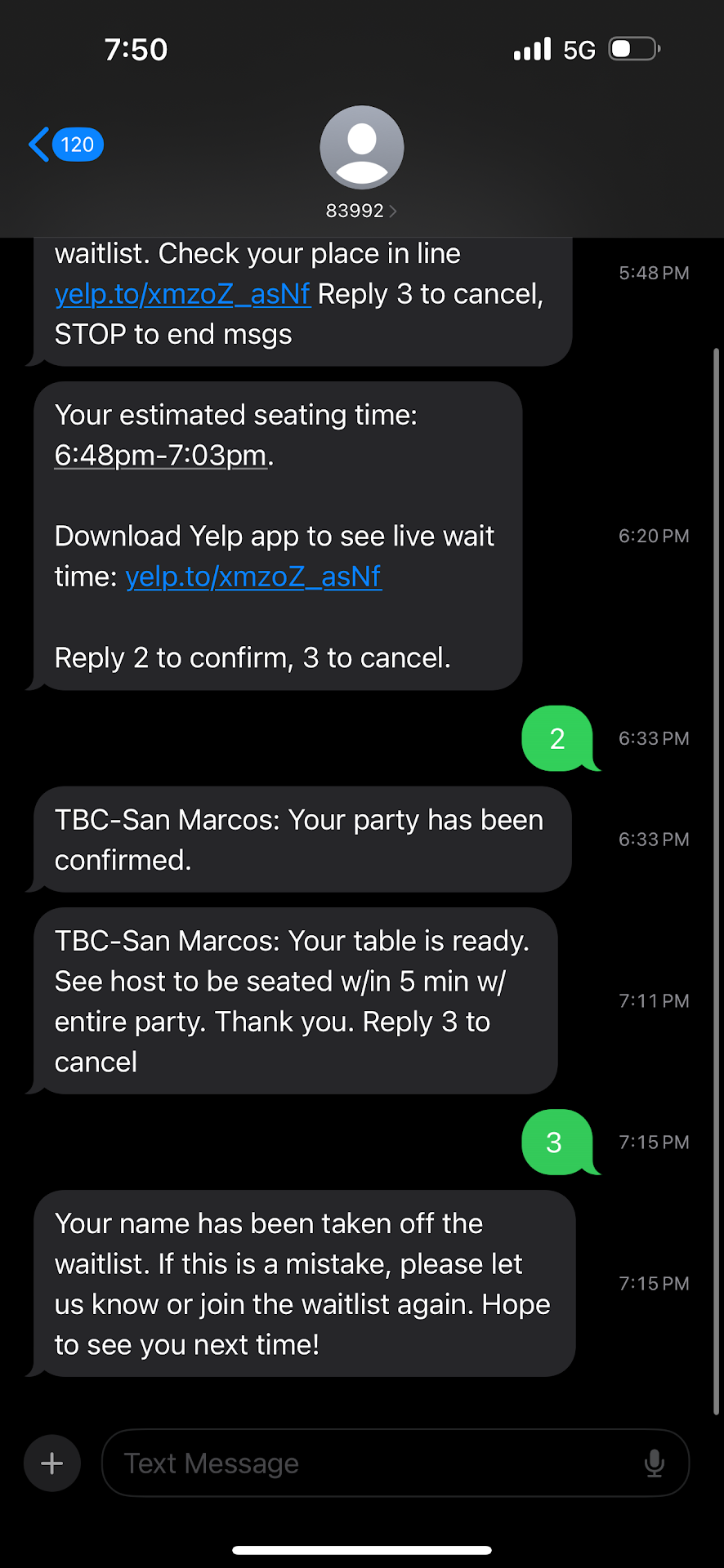 This is NOT how you do service. If you have some greedy business reasons that make it better to use a waitlist system with no reservations, fine, but you could at least try to not make it a pain just to join the waitlist, I'm not trying to make my grandparents sit around waiting for a spot on the waitlist to open up, I want to be able to join the waitlist, be given a time I need to show up at, and show up at that time to be seated. If we are seated too early, not everyone can make it (some of my family is at work), if we are seated too late, then we are accommodating for elderly people who can't sit around waiting for an hour.