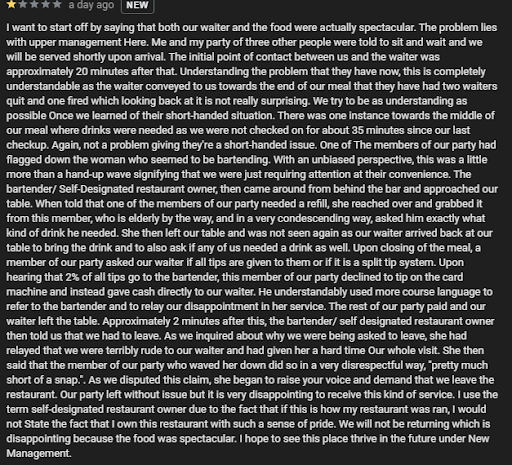 I would like to personally apologize to Sara, who you indicated was our waiter, if she felt that any Ill will was directed towards her. She was the star of our experience. Again, the problem lies with the upper management. She did a great job despite the roadblocks put in front of her by your lack of employee retainment. I hope to see her prosper at a different location where she would have a significantly better day-to-day and future experience under somebody who manages their team better. Given the recent reviews by former employees, it's no surprise as to your lack...