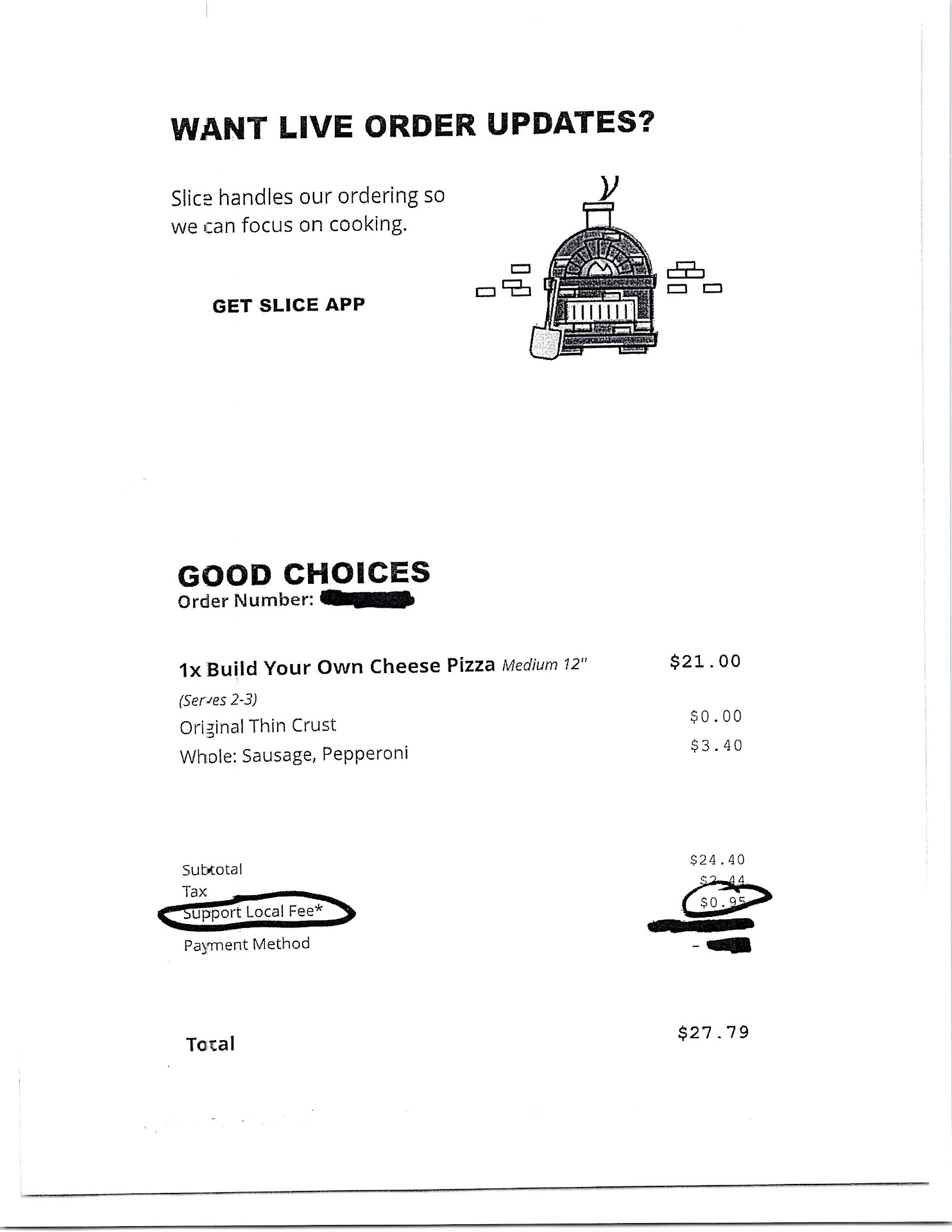 The support local fee reads like a ācommunity feeā to support and keep Aldoās and other pizzerias āthrivingā. Huh? I donāt care about other pizzerias. I catered Aldoās using their website order online menu. The fee feels like a way for Aldoās to pad the bill to make more profit. If thatās the case, then Aldoās should simply raise their prices and lose the support local fee. If however, the fee is truly a fee to help Aldoās and other pizzerias thrive, then make it a voluntary fee for Aldo's customers, not a mandatory one. Either way, the additional fee...
