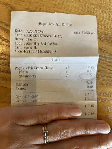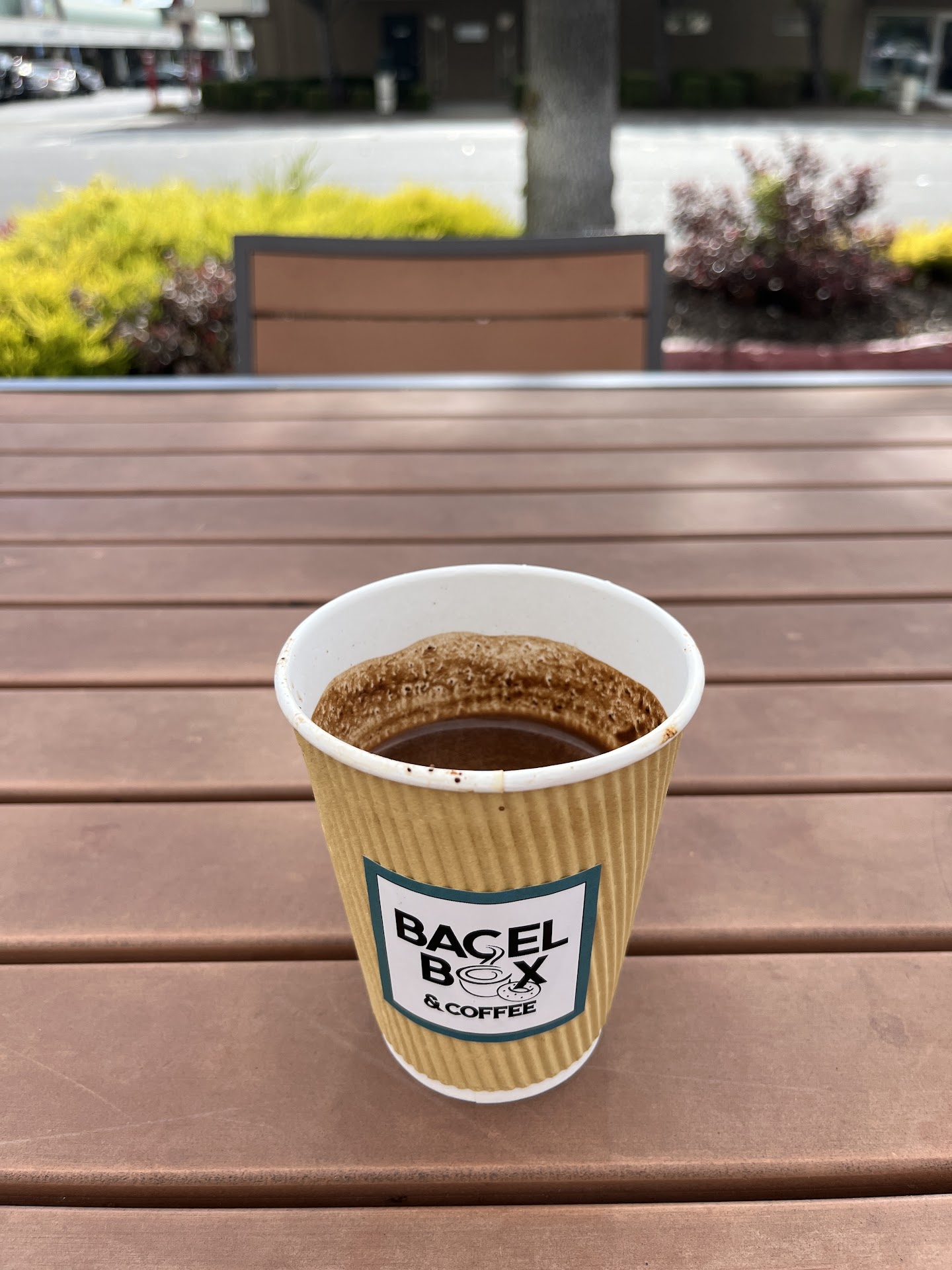 I got a toasted sesame bagel with cream cheese. There's other places where I can get the same thing in higher quality and for cheaper, but the convenience of Bagel Box and Coffee cancels that out. Overall, I might...