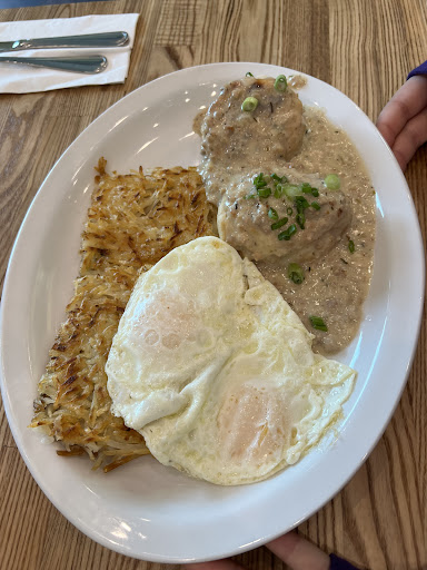 We had the pancakes, French toast and biscuits and gravy. The French toast was soft on the inside but had some batter still uncooked. The gravy was a new flavor for us, not particularly our fav as we prefer a more traditional gravy. Pancakes were great. Syrup was tasty and served warm. Eggs, great. Pork sausage was ok. I’ll have to try the chicken or bacon next time.