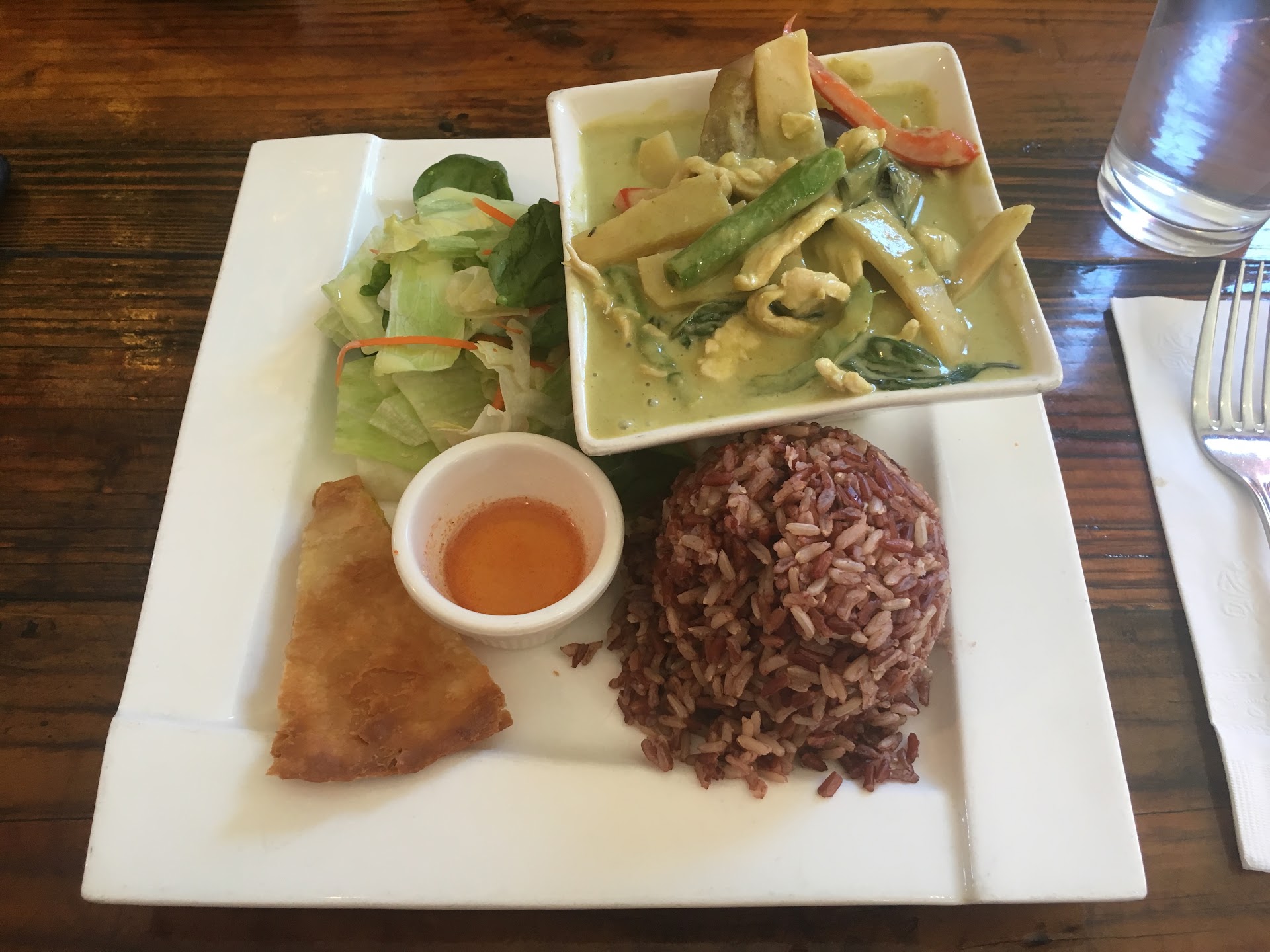 One of the only thai restaurants around so it is busy even on a week day. Staff is pretty busy during dinner and just gives you your plate and your drink, no refills on water, unless you flag down someone. Quality of food is good bc not too oily but could use flavor. Serving size is on the smaller end. Try other thai places...