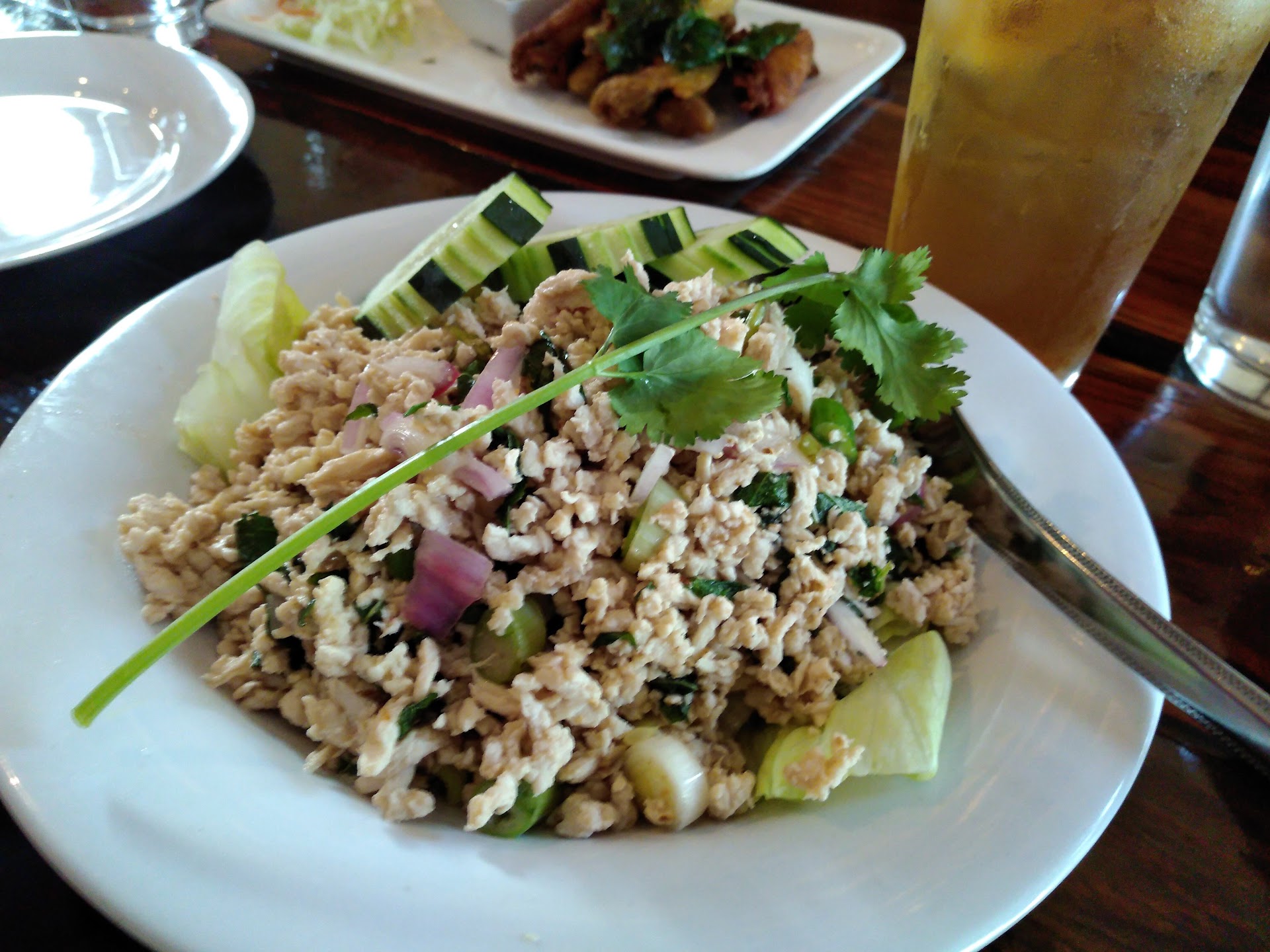 We had larb- lime-tangy, crunchy veggies, it's really good. Then the food started coming out - pad Thai, pad se-ew, green chicken curry, pineapple fried rice. Moat places skimp on the black bean with pad se-ew but Charm Thai nails it. The curry had enough spice and creaminess to be interesting without calling SMFD. Maybe the most impressive is the Garlic Fish-pieces of sole deep fried crunchy and hot, fish is flaky moist and tender. Change my order to the fish AND chicken wings with the rice and I'm good for dinner! The place is kinda small but food comes quick and their quality is spot on. The staff is friendly, they keep the water coming...but splurge and try the lychee ice tea. A bit sweet but nothing some water won't fix, but if the curry's a bit hot you'll be happy you did. Great stuff Charm Thai,...