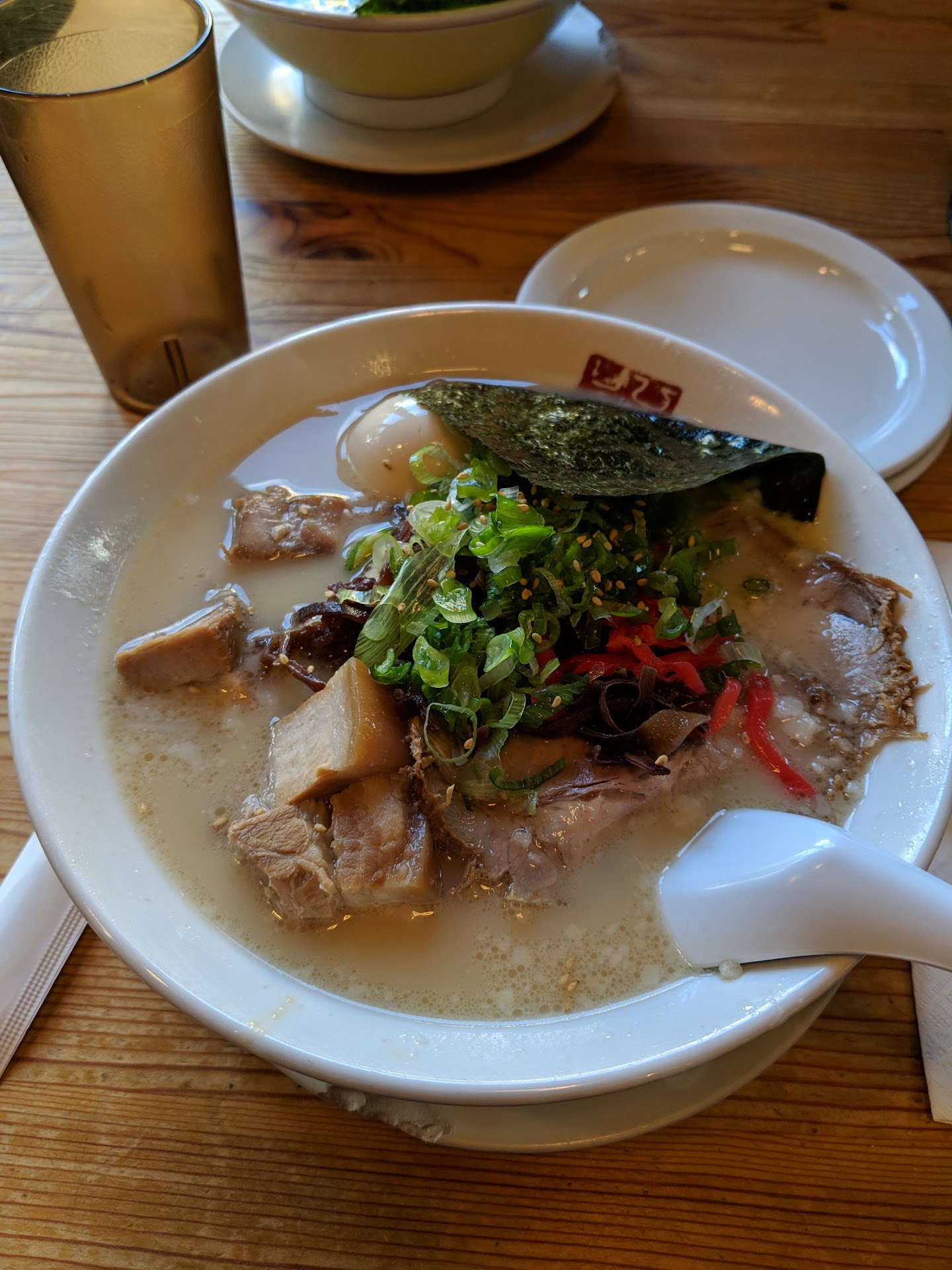 The ramen: They have a lot of menu options, and don't really seem to have a specialty, so I got the Deluxe Tonkotsu. Overall, it was good, but I wasn't blown away and wouldn't wait in a large line for it. The Broth: The broth was fairly light, but had a fairly pure Tonkotsu flavor. I could see some fat (usually meaning they cooked it for a fair amount of time), but I wouldn't say it was really rich, and could have used a bit more seasoning. The Noodles: The noodles were a thinner hakata style noodle typically used for Tonkotsu. They were good and the portion was quite large. The Toppings: The deluxe version came with a lot of negi, some chashu, kakuni, mushrooms, and an egg. The chashu and kakuni were flavorful and well cooked, but the egg was overcooked.
