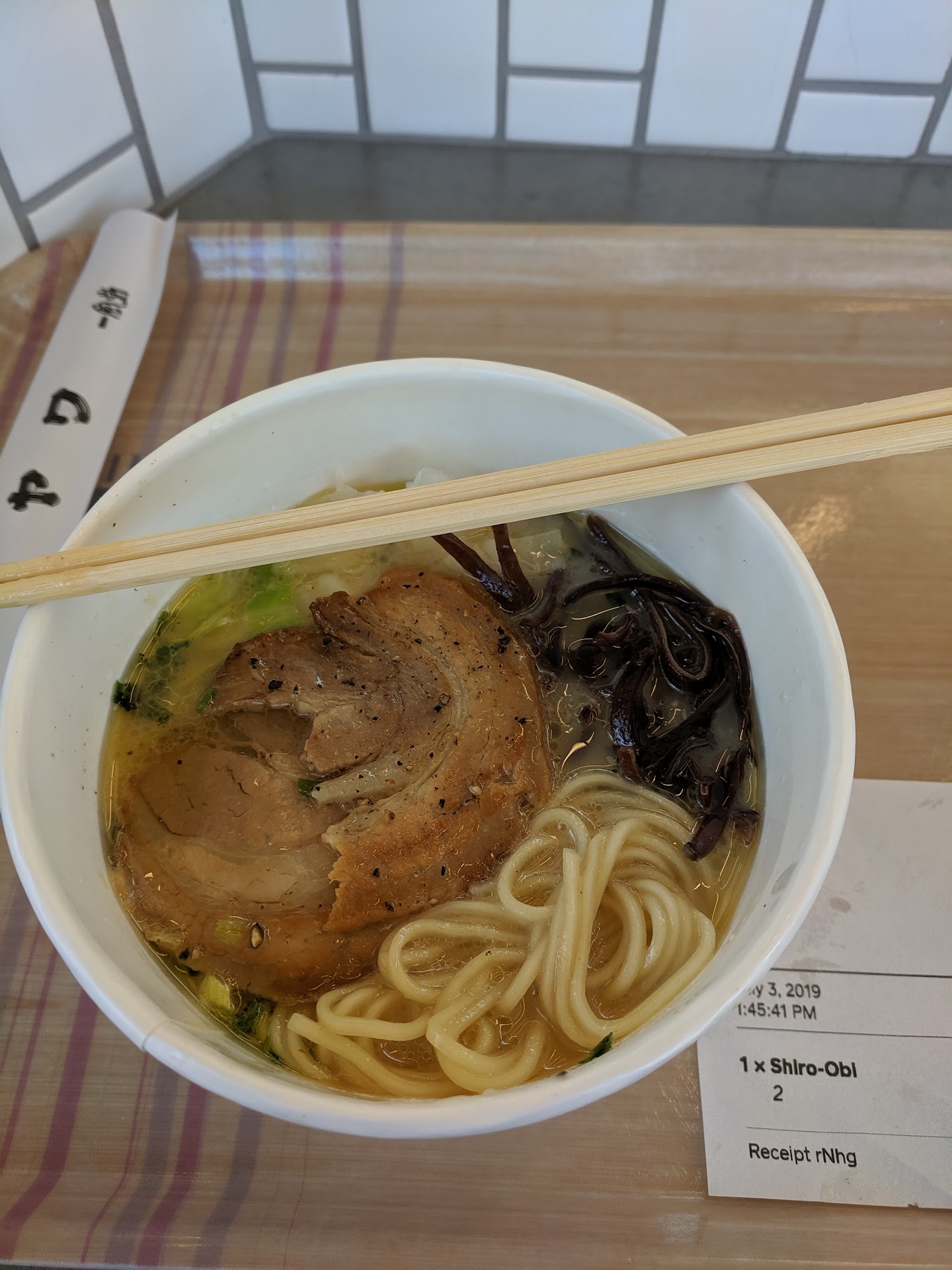 One person complained about the lack of flavor - I got the shiro obi and I can kind of see why people might find it a little lacking. It wasn't obvious at first but with a mouthful of noodles the broth was a little light. For chicken this is a pretty good version though, and a lighter option when I'm not as hungry. If I sip the broth by itself I find it perfect though.