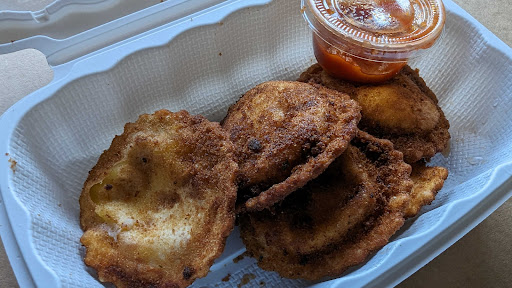 The toasted ravioli was HAMMERED. It was very hard on the edges and difficult to eat. The center was softer, but still overcooked - the filling was dry. No amount of the tiny cup of marinara that was provided could make up for how dry they were. The pizza were fine. I've had better, but I've also had worse. The crust is good and the cheese is flavored well enough, but it isn't mind-blowing. I'd rate is a 6/10. For the price, there could have been a bit more pepperoni added. The Tiramisu was okay... it tasted very industrial, as if bought wholesale and re-packaged for individual sale. No complaints about the salad.